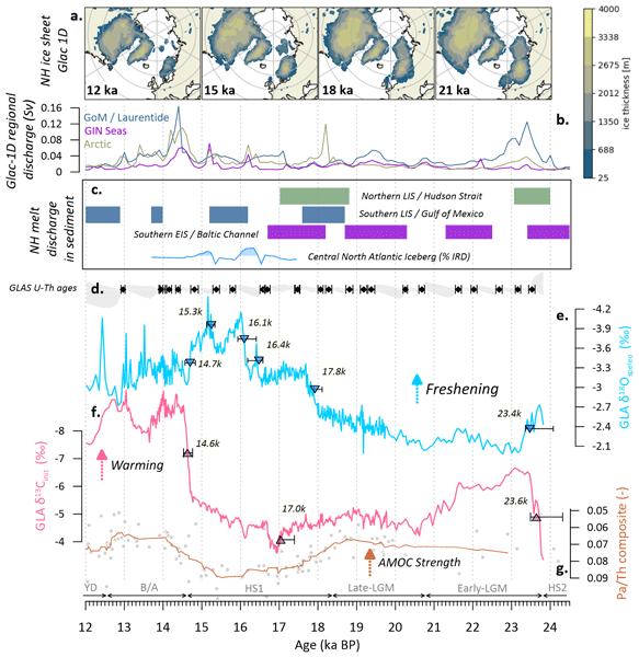 Stable isotope data of a precisely dated stalagmite from northwestern Iberia indicate gradual North Atlantic meltwater input during the last glacial maximum, followed by abrupt surges early in the last deglaciation. The first abrupt surge was decoupled from first cooling about 810 years later – unlike later events – which reveals that the Atlantic circulation’s sensitivity to meltwater is variable and related to the evolving background climate boundary conditions.