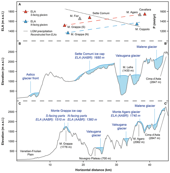 The work shows detailed reconstructions of the glaciers in the Valsugana area (south-eastern Alps) during the Last Glacial Maximum (LGM) and is supported by robust evidence and new exposure datings. These are the first ages for the internal sector of the south-eastern Alps. Local glaciers not connected with the major ice network were used for the calculation of their equilibrium line altitude. This let us estimate LGM palaeoprecipitation and compare it to Alpine palaeoclimatological models.
