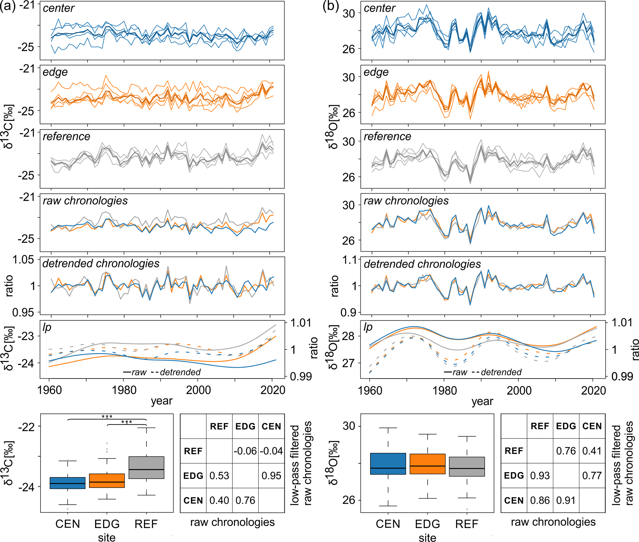 Figure 3Tree-ring (a) δ13C and (b) δ18O data spanning from 1960 to 2021. Each panel (a) and (b) presents the raw series from the center (CEN), edge (EDG), and reference (REF) sites; the corresponding raw and detrended chronologies; and 30-year low-pass filters of the raw (solid lines) and detrended (dashed lines) chronologies. Boxplots show the differences in mean raw δ13C and δ18O values across all three sites ( < 0.001). Tables display correlations between raw δ13C and δ18O site chronologies and 30-year low pass filters of the raw chronologies.