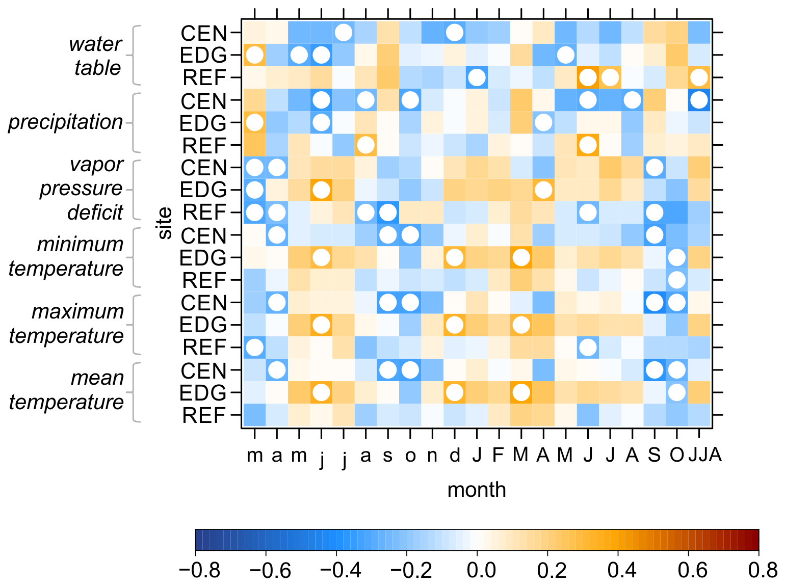 Figure 6Pearson correlation coefficients between the detrended tree-ring width site chronologies (CEN = center, EDG = edge, REF = reference) and hydroclimate variables. These variables include raw instrumental (water table) and raw gridded (precipitation, vapor pressure deficit, minimum, maximum, and mean temperatures) data. The correlations were computed for the period from March of the year preceding xylem cell formation to October of the current year and combined June–August (JJA). White circles indicate significant correlation at p < 0.05.