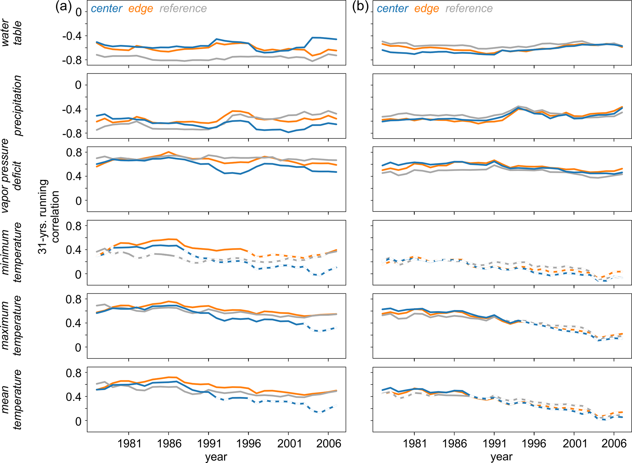 Figure 9Temporal stability of the raw (a) δ13C and (b) δ18O site chronologies and hydroclimate data (water table, precipitation, vapor pressure deficit, minimum, maximum, and mean temperatures), calculated using a 31-year moving correlation. Solid lines indicate statistically significant correlations at p < 0.05.