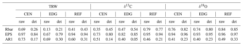 Table 1Characteristics of the raw and detrended TRW, δ13C, and δ18O data from the center (CEN), edge (EDG), and reference (REF) sites. Rbar = mean inter-series correlation; EPS = expressed population signal; AR1 = first-order autocorrelation.