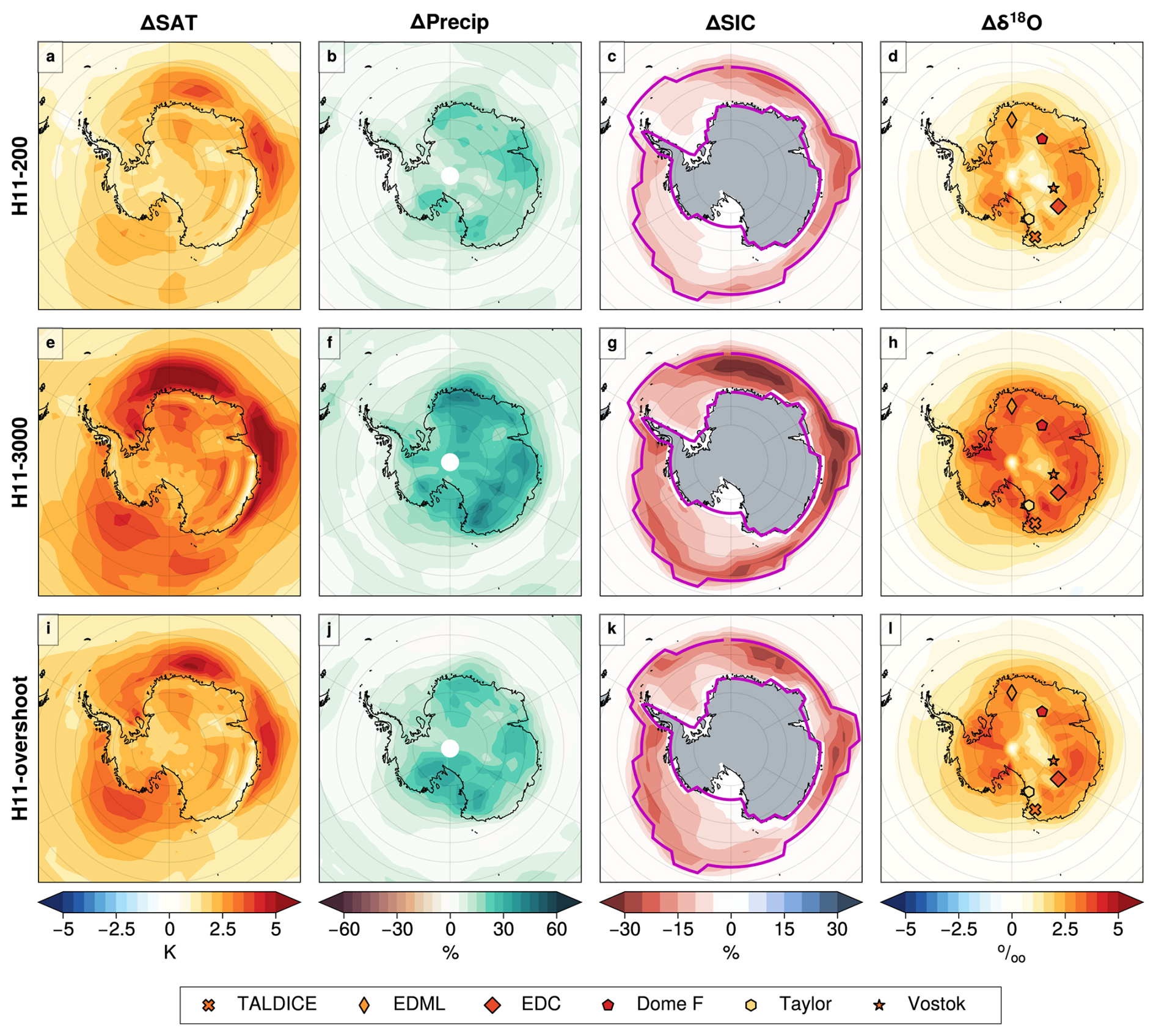 Over Antarctica the H11 simulations show relatively uniform ΔSAT, ΔPrecip, and Δδ18O (Fig. 6). The H11 Antarctic core-mean values for ΔSAT are +0.5, +2.0, +3.0, and +2.4 K at 0, 200, and 3000 years and for the overshoot. Core-mean Δδ18O values of +0.0 ‰, +1.9 ‰, +3.1 ‰, and +2.3 ‰ follow a similar pattern to the temperature changes (Table A1; Fig. 6). These simulated values compare to the observed core-mean Δδ18O value of 3.3 ‰. This means that the H11-3000 simulation captures 94 % of the observed Antarctic core-mean Δδ18O. This is commensurate with the previous sections which also show that the longer H11-3000 simulation also captures 50 %–100 % of the Southern Ocean warming and sea ice loss.