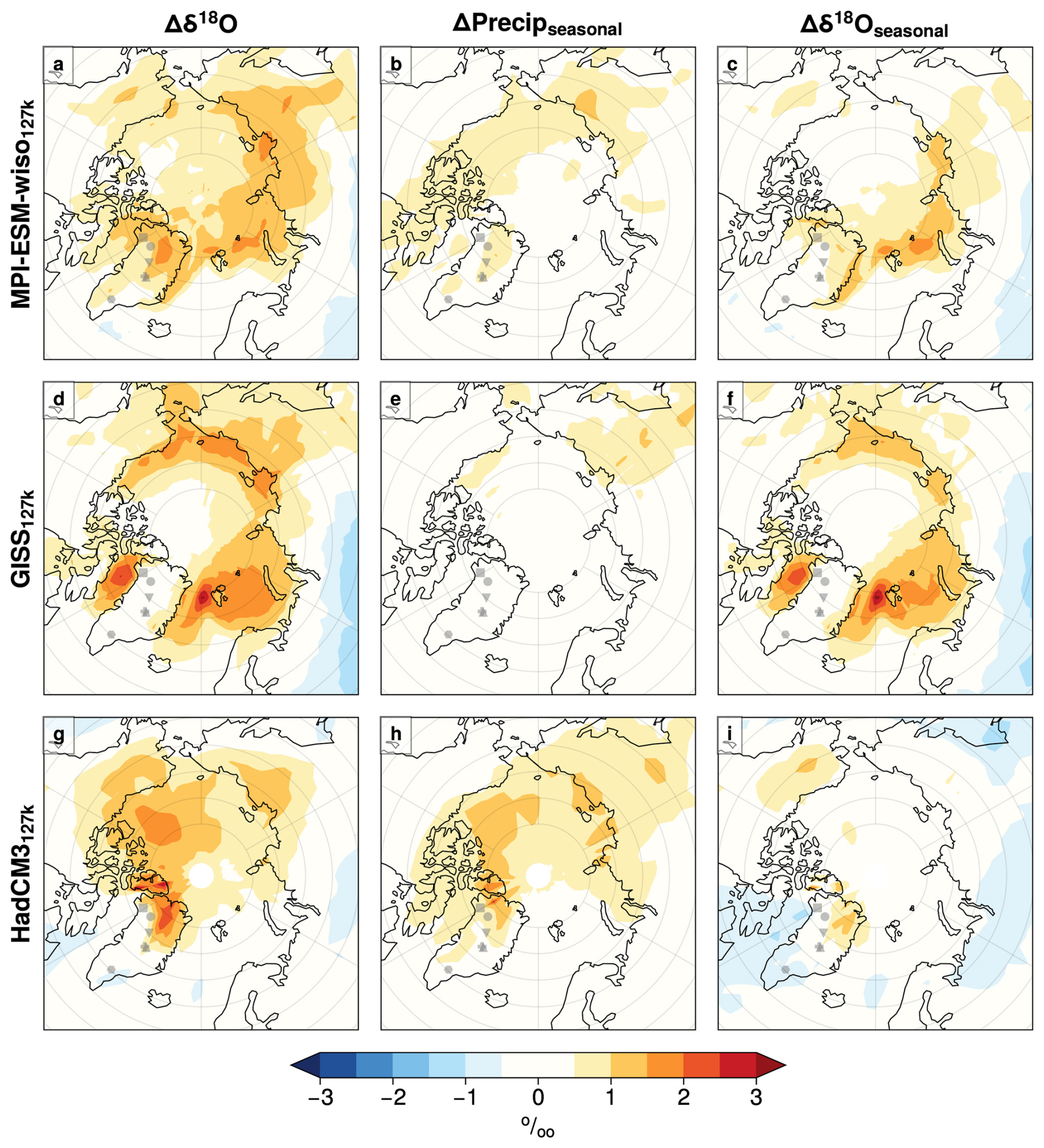 Figure 7The impact of seasonality change on Δδ18O: decomposition of Δδ18O values into contribution from seasonal variability in precipitation (ΔPrecipseasonal) and source variability (Δδ18Oseasonal) in the Arctic for the 127k simulations. See Sect. 2.2.2 for full details.
