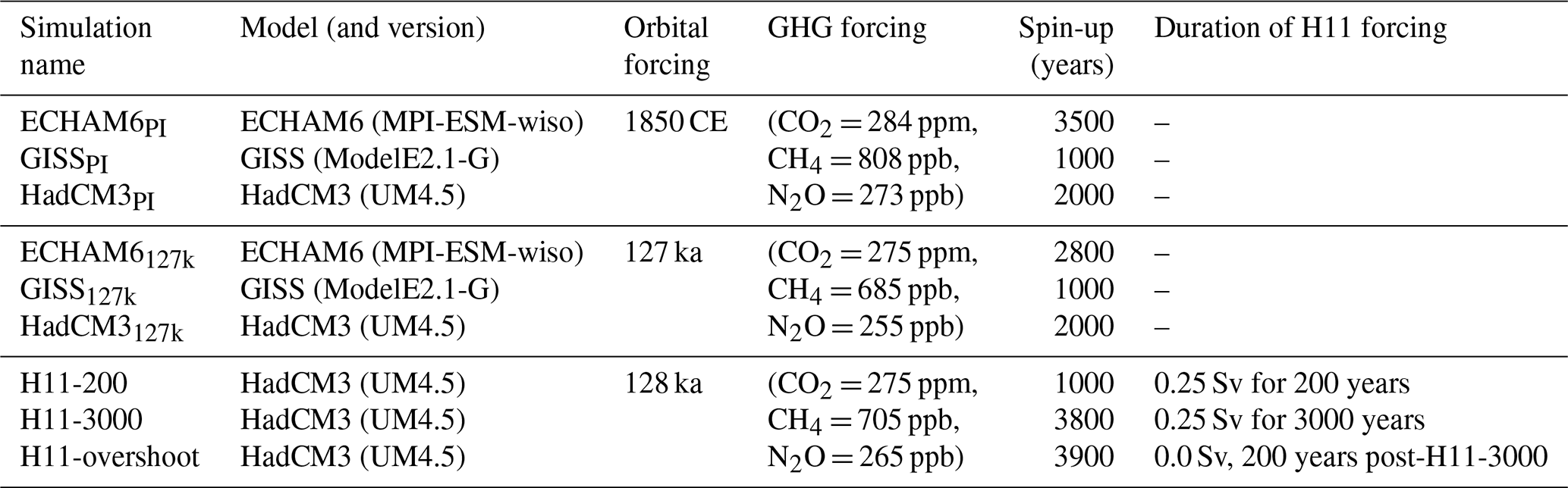 The meltwater forcing is then stopped, and an additional simulation is branched off at 3000 years, where orbital and GHG forcing continued to be applied but no further meltwater is added. This extra branch is useful to capture the initial effects of post-H11 recovery, sometimes referred to as the AMOC overshoot. As in Table 1, these simulations are referred to as H11-TIME/BRANCH.