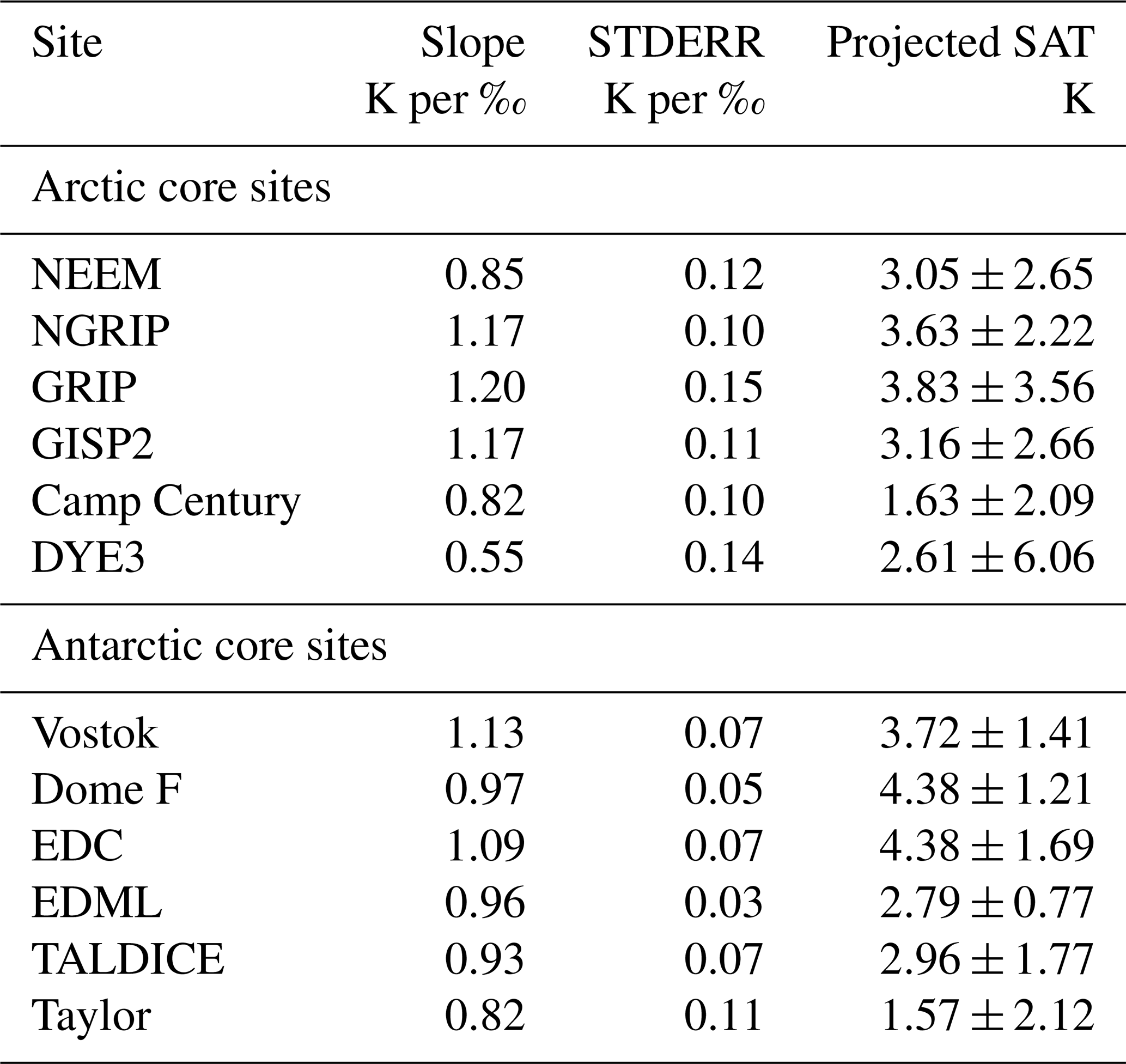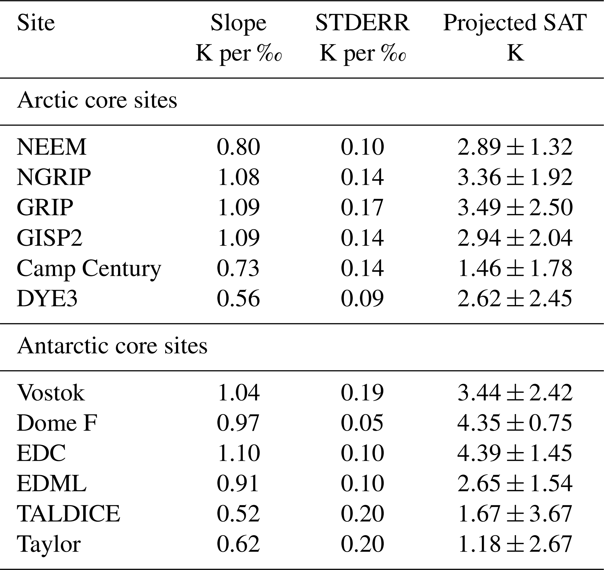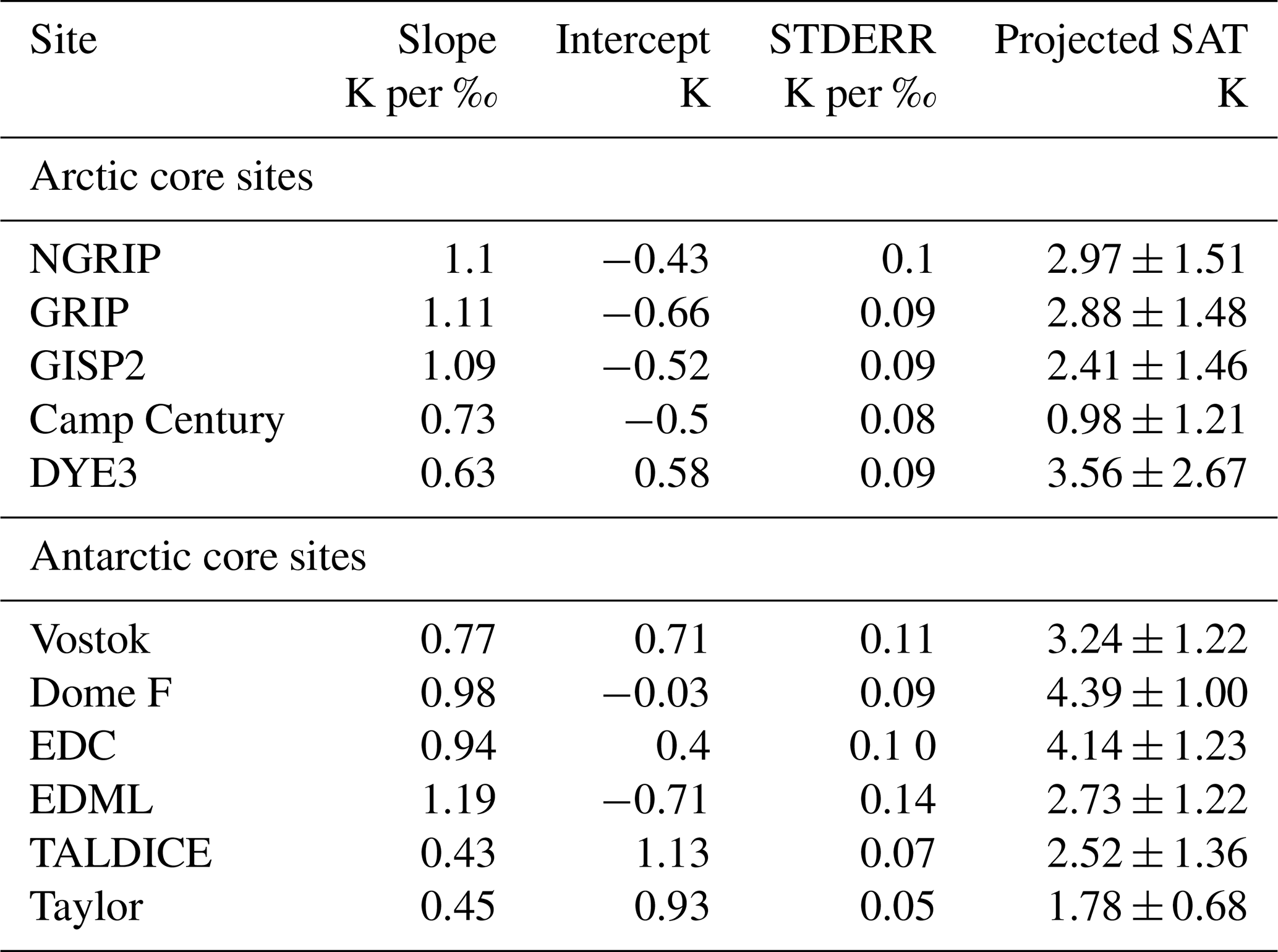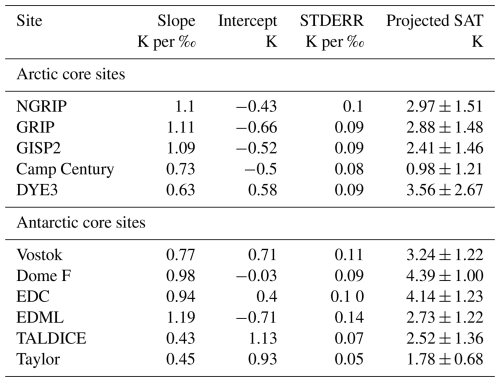 Table 2Relationships between SAT and δ18O, calculated using all model simulations for each site. Fits use Δδ18O as the dependent variable and ΔSAT as the independent variable to enable projection of ΔSAT from Δδ18O. See also Sect. 2.2.3. The projected ΔSAT values are shown with 95 % confidence intervals and are based on the ice core Δδ18O values in Table A1. STDERR: standard error.