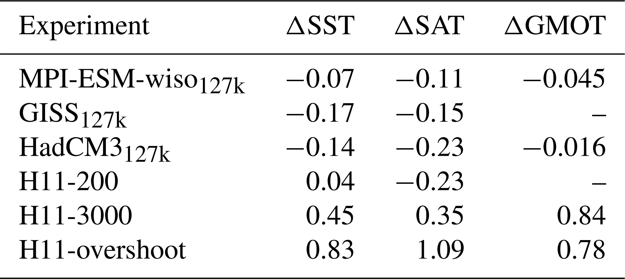 The 127k simulations show a small global cooling with global-mean ΔSAT from −0.23 to −0.11 K and ΔSST from −0.17 to −0.07 K (Table A2). In association with this, HadCM3127k and MPI-ESM-wiso127k show a cooling of −0.016 to −0.045 K in global-mean ocean temperature (GMOT). The longer H11 simulations show progressive global warming during the H11 event: the H11-200, H11-3000, and H11-overshoot simulations show global-mean ΔSAT of −0.23, 0.35, and 1.09 and ΔSST of 0.04, 0.45, and 0.83 K, and ΔGMOT for the H11-3000 and H11-overshoot simulations are both +0.8 K (Table A2). Thus, whilst all 127k simulations show a slight global cooling, the H11 simulations (particularly the H11-3000) show warmer global SST, SAT, and GMOT changes. Towards the end of the 3000 years of H11 forcing, results from these H11 simulations match the Fischer et al. (2018) and Shackleton et al. (2020) estimates of these global quantities.