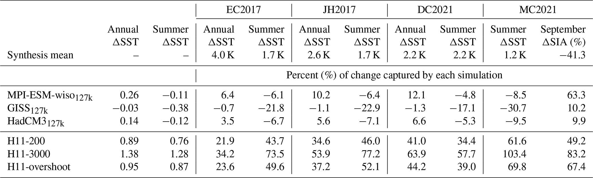 Overall, the 127k simulations do not capture the observed Southern Ocean warming and sea ice loss, but the H11-3000 simulation captures between 50 %–100 % of the warming (Table A4), depending on the particular synthesis (Gao et al., 2025) and observation type.
