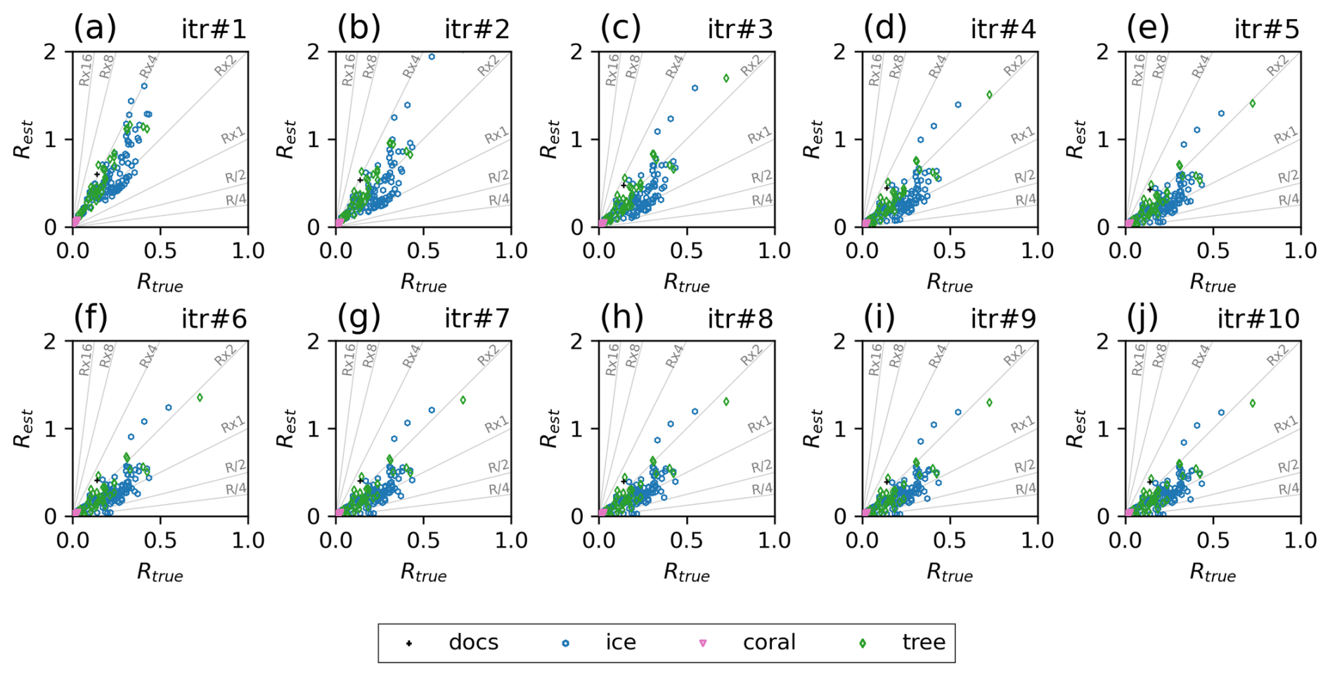 Figure 2a compares the true observation variances (Rtru) and the estimated observation variances (Rest) for EST with an initial R 16 times larger than Rtru (Rx16). Most of the estimated observations fall between the two reference lines in Fig. 2a, with slopes of 2 and 4. Given that the initial observation variances were 16 times larger than the truth, the differences between Rest and Rtru became smaller than Rini after the estimation. Improvements were observed across different proxy types, demonstrating that the estimation method functioned properly.