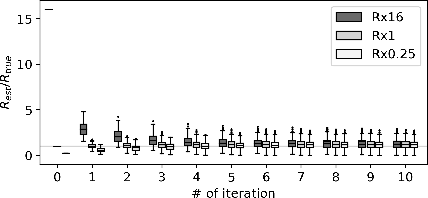 Figure 3Ratio of the estimated observation error variance according to iteration in OSSE Rx16 (dark grey), Rx1 (grey), and Rx0.25 (white). Horizontal bars of each box correspond to the 1st, 50th, and 99th percentiles. Data smaller (larger) than the 1st (99th) percentile are plotted as dots. Grey horizontal line shows a ratio of 1. The values shown at the 0th iteration are .