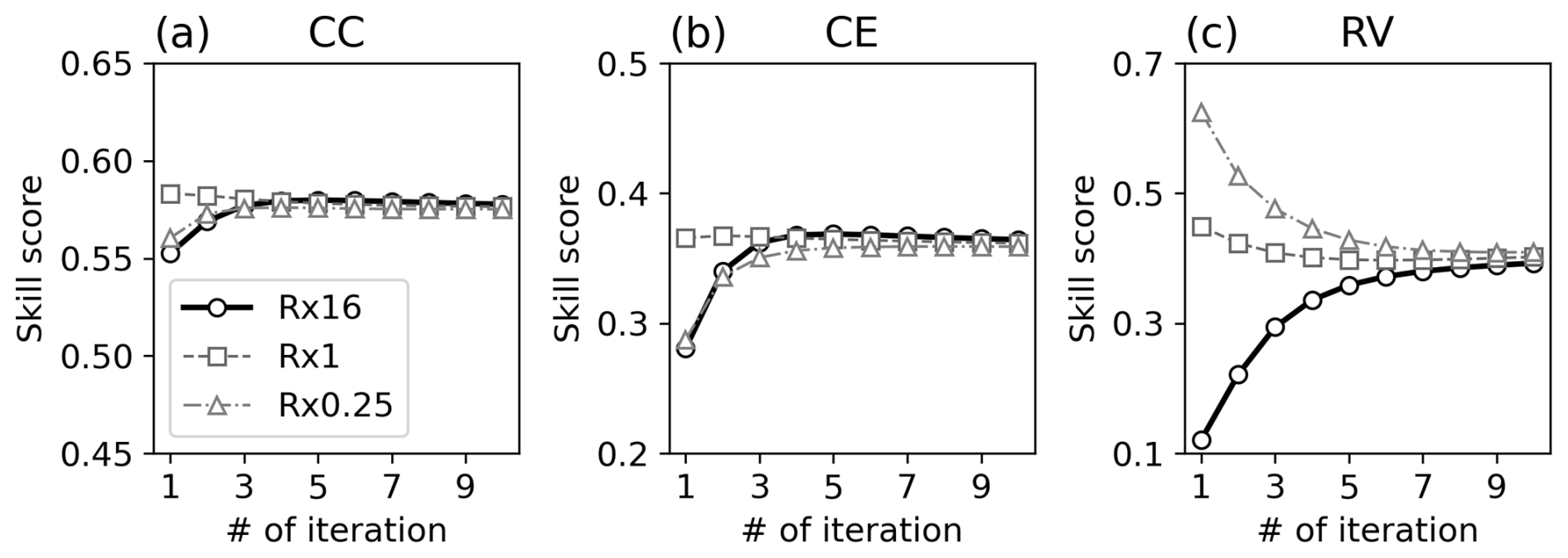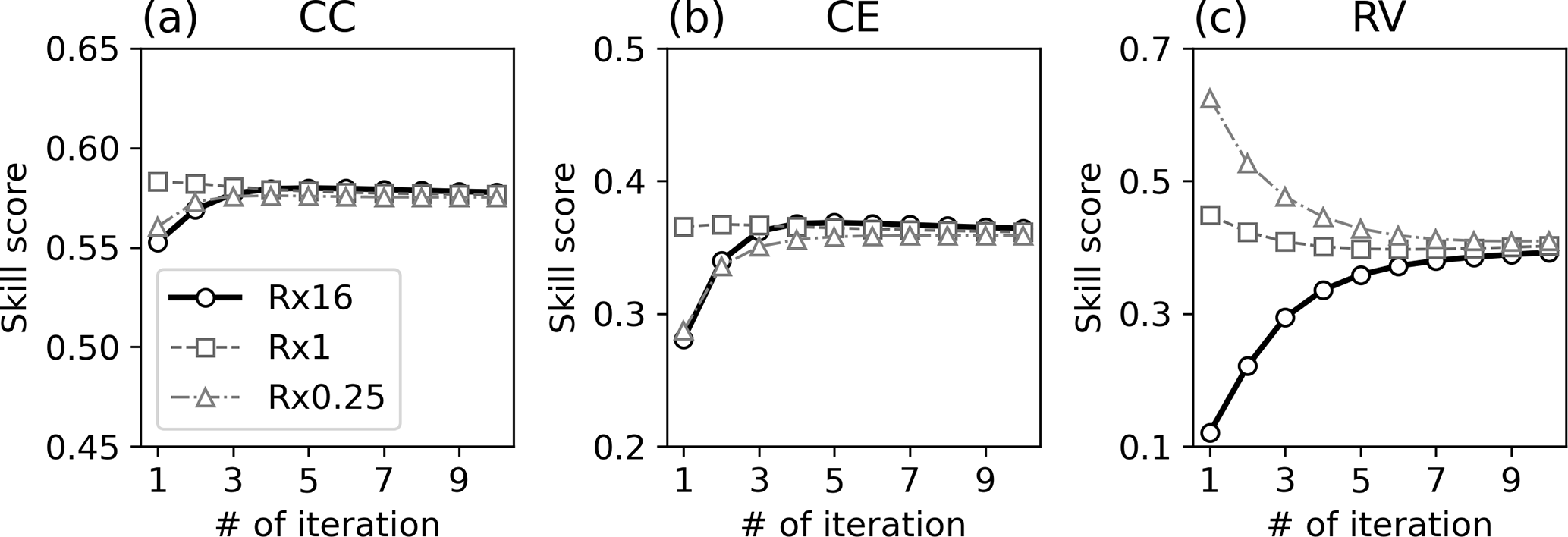 Figure 4Reconstruction skill score of (a) CC, (b) CE, and (c) RV according to iteration in OSSE Rx16 (thick black line with circle), Rx1 (thin dashed grey line with square), and Rx0.25 (thin dashed-dotted grey line with triangle).