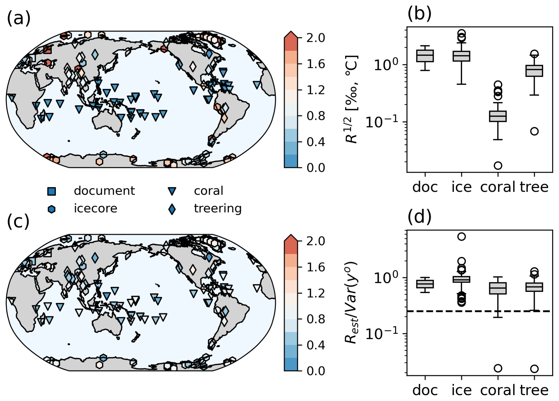 Observation errors were estimated using innovation statistics, as in Sect. 3, but for real observations. The estimated errors after the 10th iteration ranged from 0.79 to 2.11 °C (mean of 1.59 °C) for surface temperature, from 0.45 ‰ to 3.50 ‰ (mean of 1.42 ‰) for ice cores, 0.02 ‰ to 0.44 ‰ (mean of 0.12 ‰) for corals, and 0.07 ‰ to 1.54 ‰ (mean of 0.82 ‰) for tree-ring cellulose (Fig. 6a and b). Errors can be expressed as the ratio of Rest to the variance of each observation. At most locations, the estimated observation errors exceeded one-fourth of the variance, which is the typical value for paleo-DA (Fig. 7c and d). Although the estimated observation errors were system specific, as shown in Eq. (2), these results suggest a need for reconsidering the size of observation errors in paleo-DA. The corresponding SNRs were approximately 1.25 and 1.22 for the corals and tree-ring cellulose, respectively, whereas the SNR was approximately 1.0 for ice cores, indicating that either measurement, representativeness, or observation operator errors for ice cores are larger than those for the other proxy types. This may be because no PSM was applied for ice cores. However, even with PSM, the estimated SNR should be smaller for ice cores because the skill of the PSM is found to be relatively low compared to the skill of coral and tree-ring cellulose (Okazaki and Yoshimura, 2019). The estimated SNR for the surface temperature (1.14) was smaller than that estimated by Valler et al. (2022) (2), showing that the estimated error was larger in the current study. This was likely due to the coarser horizontal resolution of the background in this study (T42) compared with that in Valler et al. (2022) (T63).