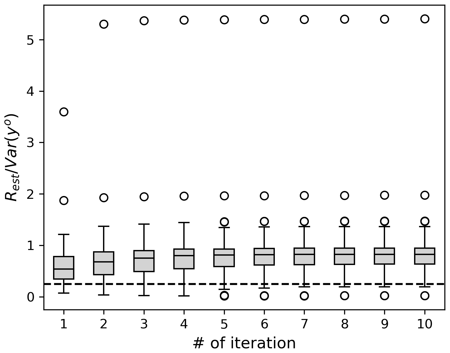 Figure 14 compares the estimated sizes of the observation errors after the 20th iterations and . Here, is expected to be 2 because the error variances of the prior and observation are both 1.0 (see Eq. 16). However, the estimated values varied between 1.2 and 2.7, highlighting the effect of sampling error. We observed a strong correlation between the estimated observation errors and . Specifically, when is overestimated, the Rest is also overestimated, and vice versa. This occurs because R is estimated based on (see Eq. 18). Therefore, if is biased due to sampling noise, Rest will also be systematically biased.
