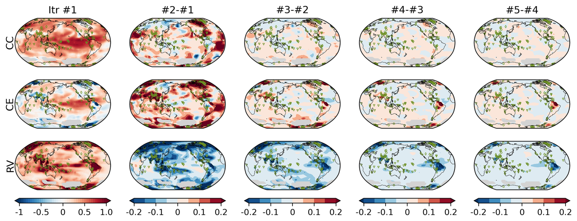Figure 5Reconstruction skill score of (top) CC, (middle) CE, and (bottom) RV in OSSE EST Rx16. Left column shows the reconstruction skill at the first iteration (i.e., without observation error estimation). Second to fifth columns show the skill difference from the previous iteration; for instance, the second column shows the difference between second and first iterations. Markers in each map show the position of proxies.