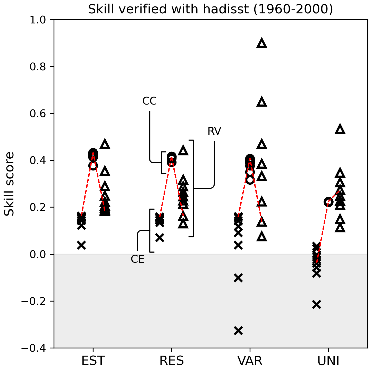 Figure A3Surface temperature reconstruction skill score for the REAL EST, RES, VAR, and UNI experiments based on the CC (circle), CE (triangle), and RV (square). The scores were calculated with GISTEMP for 1960–2000.