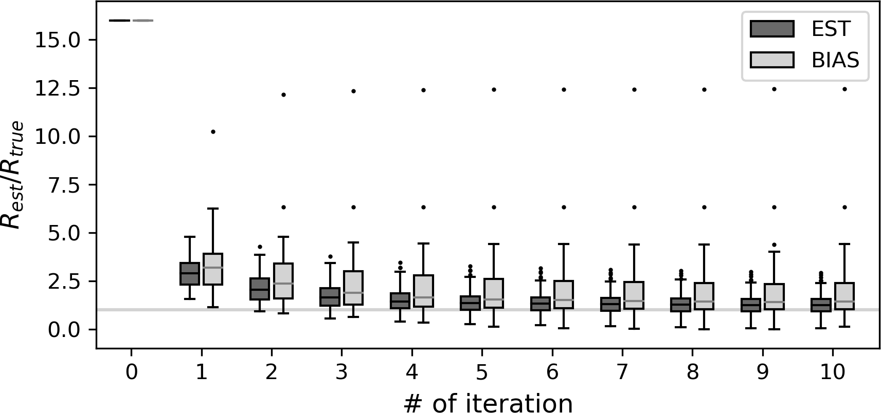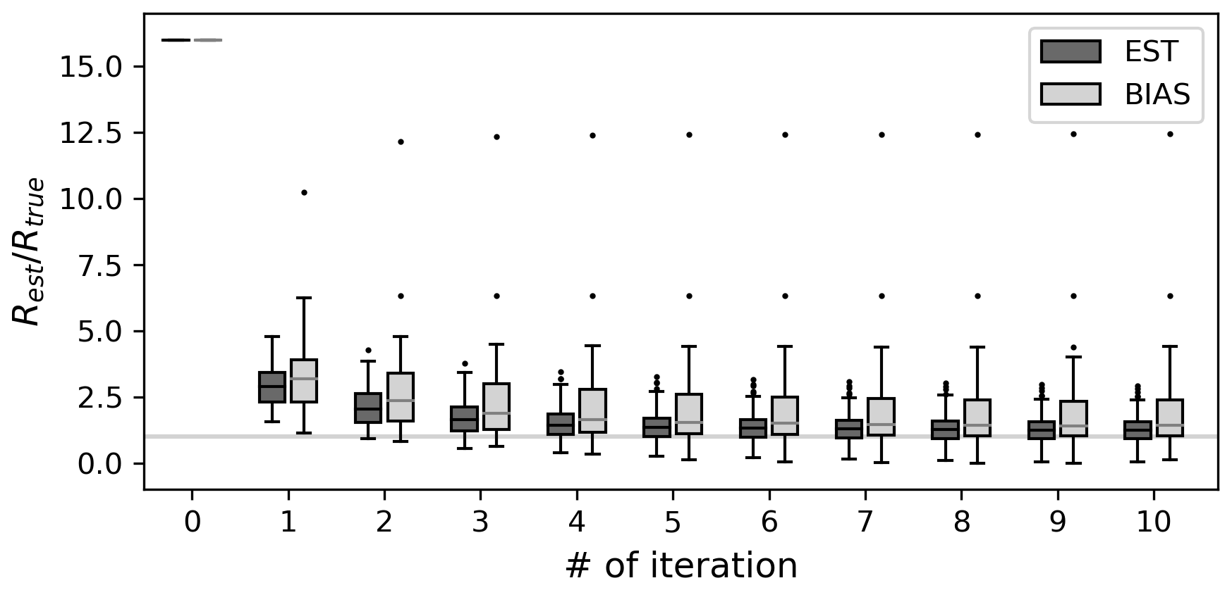 Figure 12 shows the estimated observation errors for the BIAS experiment and compares them with those from the OSSE EST Rx16. The observation errors were consistently overestimated in BIAS for all the iterations. Although the iterative estimation brings Rest closer to Rtru, the discrepancy was larger than that in the unbiased case. Moreover, the ratio of Rest to the Rtru exhibited a wider distribution compared to that without bias, indicating greater uncertainty in error estimation. Nevertheless, the reconstruction skills are all improved with Rest, although the improvements were less pronounced than those without bias (Fig. 13). These findings suggested that the innovation statistics remain effective even in the presence of model bias and that the reconstruction skills can still be improved through observation error estimations. The effectiveness of this method likely depends on the magnitude of bias. However, the innovation statistics exhibited some tolerance to biases in B, which is consistent with previous findings (e.g., Li et al., 2009).