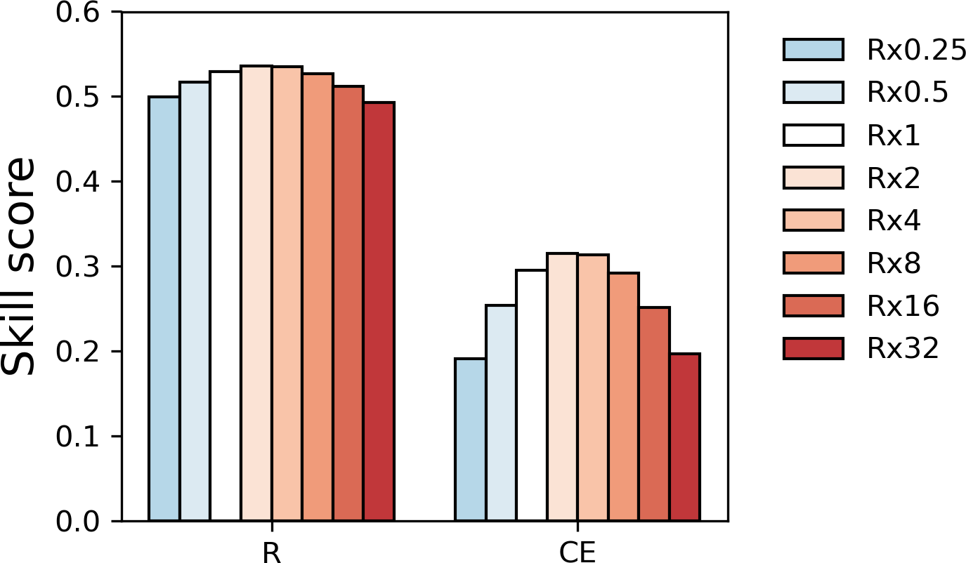 The sensitivity to the observation error variance was examined using the configuration of the OSSE. In this experiment, we tested the effects of variation in R = kRtru. The scaling factor was set to 0.25, 0.5, 1, 2, 4, 8, 16, or 32. The reconstruction skills ranged from 0.5 to 0.55 for CC and from 0.19 to 0.32 for CE, respectively, showing the importance of using accurate observation error R in DA.