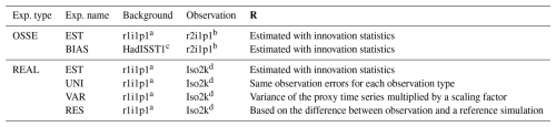 We conducted two series of DA experiments, OSSE and REAL, which only differ in the observations to be assimilated. In OSSE, we created the observations using a reference simulation (so-called “nature run”) and observation operators. As such, OSSE can be considered an idealized experiment and is equivalent to the idea of pseudo-proxy experiment in paleo-DA (e.g., Steiger et al., 2014). The background ensemble was created using the same model as that for the nature run (i.e., perfect model experiment) but with slightly different external forcings (see below for more details). This allows for a direct evaluation of the observation error estimation in the absence of other error sources. We also performed climate reconstruction with the estimated observation errors in REAL, which uses real observation data for DA. In addition to the differences in observations, the OSSE and REAL experiments shared the same experimental settings. Multiple experiments were conducted for each framework. The default experimental settings and experiment-specific configurations are detailed in Sect. 2.3.1 and 2.3.2, respectively.
