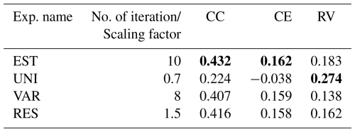 The reconstruction skills of the REAL EST were compared to the UNI, RES, and VAR experiments, which defined the observation errors in different ways (Fig. 10 and Table 2). The global mean skill scores for CC and CE were the best in the EST, whereas RES and VAR achieved comparable skills with the EST when the scaling parameter was carefully tuned. In contrast, UNI exhibits the lowest skill scores. In terms of RV, UNI performed remarkably better than the others, when the scaling factor or number of iterations was tuned with CC. Among the other experiments, EST maintained a relatively high RV, primarily because the observation errors in EST were smaller than those in RES and VAR (Fig. 10). Similar results were obtained when validating against GISTEMP (Lenssen et al., 2024; Fig. A3 and Table A1).