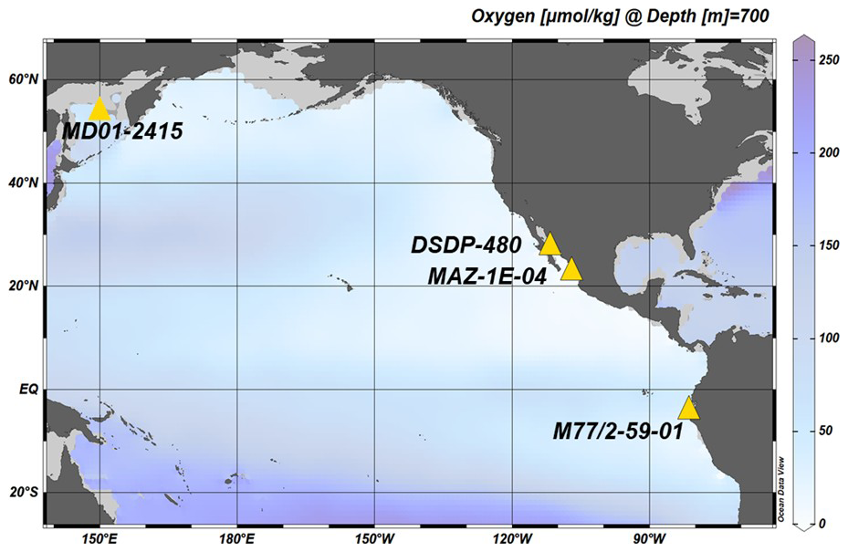 Figure 2Location of sediment cores used in the current study and mean annual oxygen concentrations at 700 m depth (Garcia et al., 2019). Sediment cores are indicated by yellow triangles: Sea of Okhotsk (core MD01-2415; water depth: 822 m), Gulf of California (DSDP Site- 480; water depth: 747 m), Mexican Margin (core MAZ-1E-04; water depth: 1463 m), and Gulf of Guayaquil (core M77/2-59-01; water depth: 997 m). Map created with Ocean Data View (Schlitzer, 2023).
