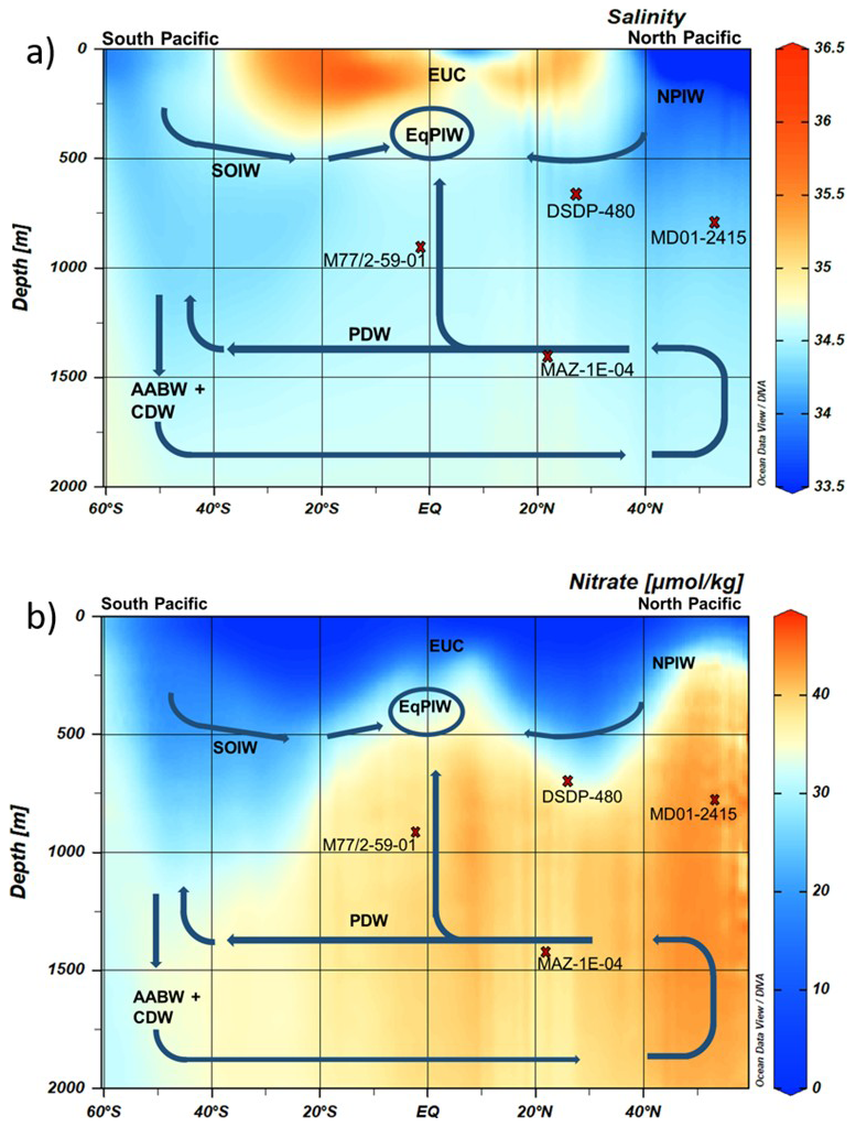 Figure 3Modern (a) salinity and (b) nitrate distribution along a N–S transect across the Pacific (Garcia et al., 2019) with major subsurface and deep-water masses (blue arrows) and formation areas of North Pacific Intermediate Water (NPIW) and Southern Ocean Intermediate Water (SOIW) are included. Sediment cores used for [NO]BW reconstruction are shown (red crosses) projected to the N-S hydrographic transect. Equatorial Pacific Intermediate Water (EqPIW), Equatorial Undercurrent (EUC), NPIW, SOIW, Pacific Deep Water (PDW), Antarctic Bottom Water (AABW), and Circumpolar Deep Water (CDW). Profiles generated by Ocean Data View (Schlitzer, 2023) using the data from World Ocean Atlas 2018 (Garcia et al., 2019).