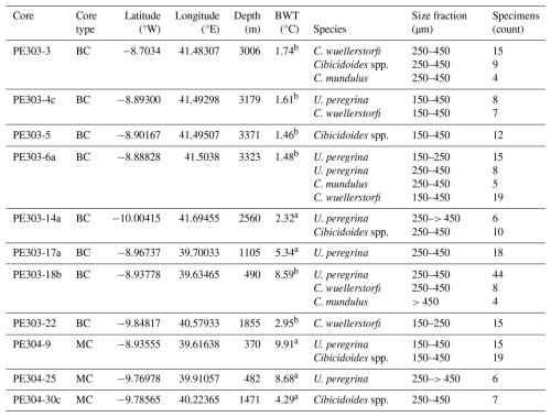 can be affected by intra-shell, intra-species, and inter-species variability referred to as “vital effects” (Bentov and Erez, 2006; de Nooijer et al., 2014; and discussions therein). In order to minimize these effects, we have focussed, where possible, on analysing multiple whole specimens of three benthic foraminifera species: U. peregrina, C. wuellerstorfi, and C. mundulus. In most cases these were picked from comparatively small size fraction windows (i.e. 150–250 and 250–450 µm). Only in a small number of cases a wider size fraction window was used due to low foraminifera abundances (Table 1). Specimens with no signs of stains, discolouration, fragmentation or post depositional calcification were selected based on previous studies suggesting post depositional effects on ratios (Lear et al., 2002) (see qualitative observations in Table C1 in Appendix C). Because temperature sensitivity of in Cibicidoides spp. might be species specific (Lea et al., 1999; Gussone et al., 2016), species of Cibicidoides spp. were analysed separately except for samples containing less than 5 specimens (Table 1). Sample PE303-18b was split into two to check for intra sample variation (the only sample with sufficient sample size). In order to test the cleaning procedure, specimens from the planktic foraminifera species Globigerinoides ruber (G. ruber) were picked from the 250–355 µm size fraction of samples from core NIOP929 (Saher et al., 2009; core NIOP929 was retrieved from the continental slope off Somalia during the Netherlands Indian Ocean expedition in 1993; van Hinte et al., 1995) because there were insufficient planktic and benthic foraminifera specimens in our off Tanzania core-top transect to carry out these tests. The samples were wet sieved over a > 63 µm screen and dried at 40 °C.