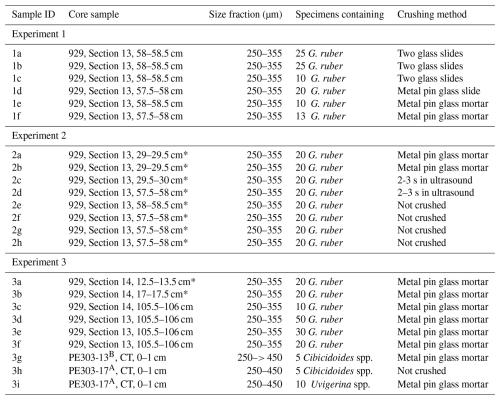 Based on the results from Experiment 3, indicating no or minor silicate contamination and Mn-oxide coatings, the cleaning methodology of core-tops followed the methodology used in Experiment 3, i.e. Barker et al. (2003). A summary of the differences in cleaning methodology used in this study is found in Table 2.