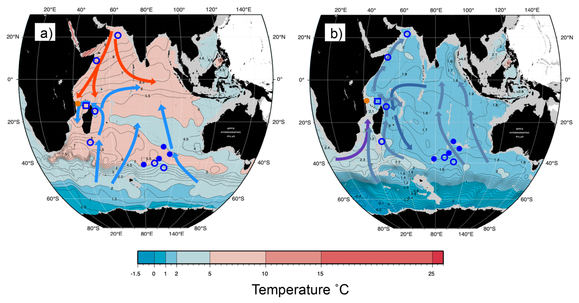 Figure 3Map of potential temperature adapted from the WOCE Indian Ocean Atlas (Talley, 2013) at intermediate and deep-water depths. (a) 1000 m with general intermediate water circulation; blue arrow: AAIW and red: RSW (b) 2500 m with general deep water circulation; lighter blue arrow: LCDW, darker blue arrow: NIDW/UCDW, and purple arrow: NADW. Approximate location of core-tops from the Indian Ocean; orange circle: this study, open square: nearest CTD transect (Birch et al., 2013), filled circle: Healey et al. (2008) and open circle: Elderfield et al. (2010).