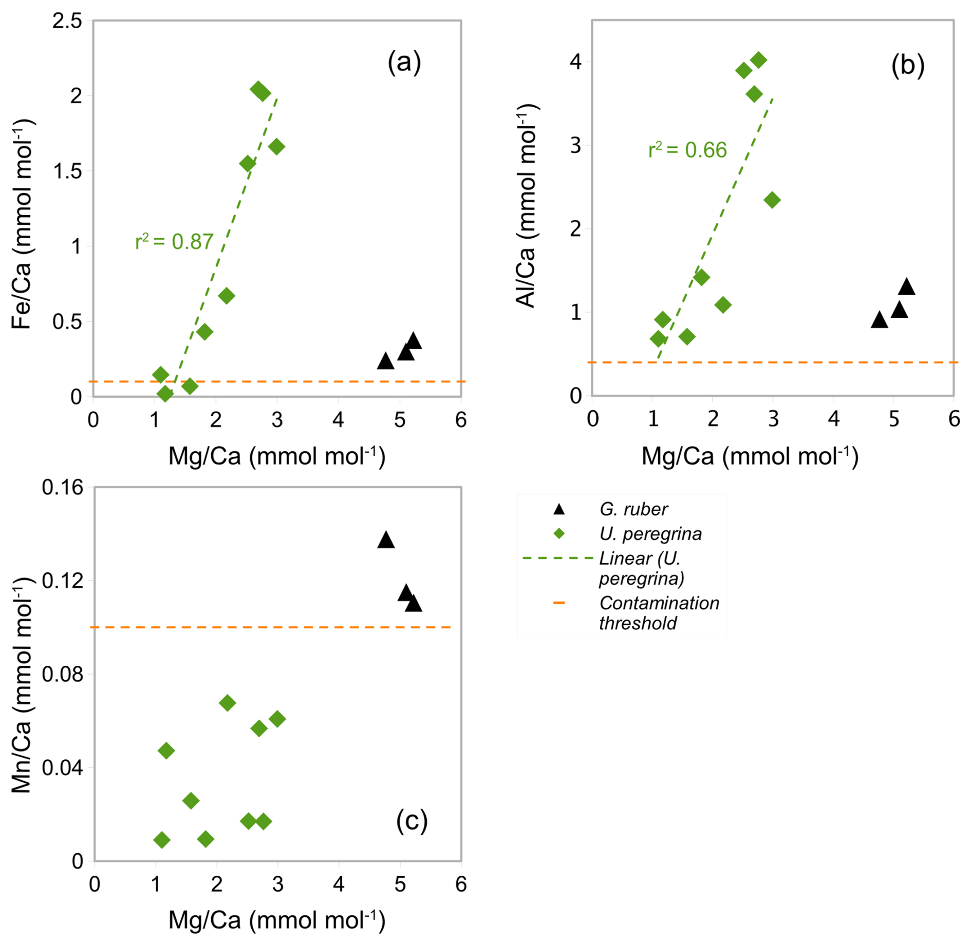 Contamination is a general problem. Despite using an established method (Barker et al., 2003), U. peregrina in particular displayed high levels of remanent contamination. The U. peregrina ratios also indicate that the contamination indicating thresholds have generally been correct in identifying samples with silicate contamination.
