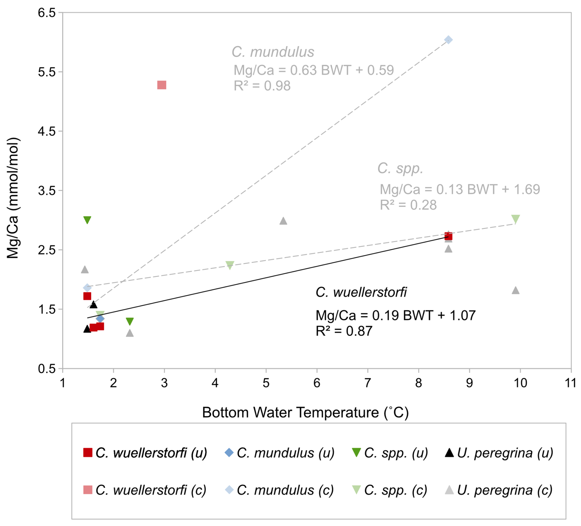 Figure 9 ratios of Cibicidoides spp., C. wuellerstorfi, C. mundulus, and U. peregrina over bottom water temperature (BWT). Pale colours: measurements with suspected significant contamination (c). Solid colours: uncontaminated/minor contamination based on contamination thresholds (0.1 mmol mol−1 , 0.4 mmol mol−1 , and 0.1 mmol mol−1 ) and correlations with (uncontaminated samples indicated by “(u)”). There are several data points where presence of contamination is ambiguous – see discussion. Black trend line represents -BWT linear correlation in C. wuellerstorfi (four samples with minor contamination); grey trend lines represent tentative -BWT linear correlations in C. mundulus and Cibicidoides spp. (contaminated and uncontaminated samples included).