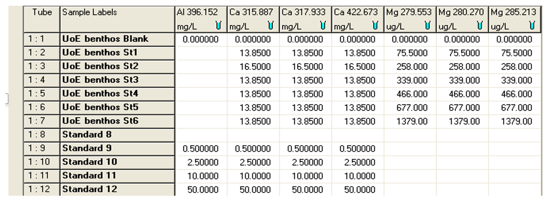 Figure B1Print screen showing the concentration of standards used (Mg in ppb and Ca in ppm) in analyses for calibration and for matrix effect. The ICP analyses were carried out on an Agilent (former Varian) Vista Pro 700. The screenshot below was taken from the ICP Expert software package (distributed by Agilent https://www.agilent.com, last access: August 2022), which is used to operate the ICP-OES.
