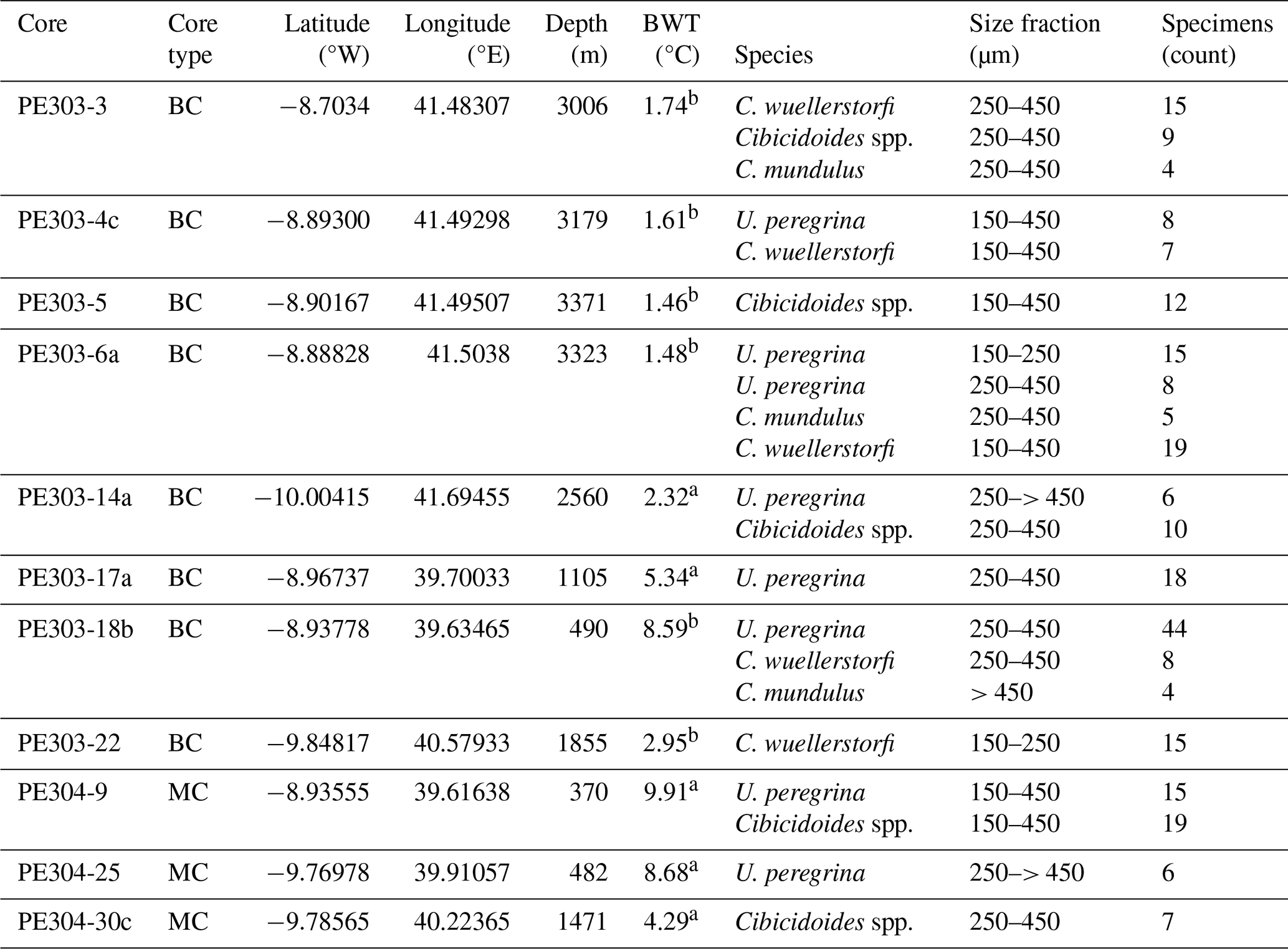 can be affected by intra-shell, intra-species, and inter-species variability referred to as “vital effects” (Bentov and Erez, 2006; de Nooijer et al., 2014; and discussions therein). In order to minimize these effects, we have focussed, where possible, on analysing multiple whole specimens of three benthic foraminifera species: U. peregrina, C. wuellerstorfi, and C. mundulus. In most cases these were picked from comparatively small size fraction windows (i.e. 150–250 and 250–450 µm). Only in a small number of cases a wider size fraction window was used due to low foraminifera abundances (Table 1). Specimens with no signs of stains, discolouration, fragmentation or post depositional calcification were selected based on previous studies suggesting post depositional effects on ratios (Lear et al., 2002) (see qualitative observations in Table C1 in Appendix C). Because temperature sensitivity of in Cibicidoides spp. might be species specific (Lea et al., 1999; Gussone et al., 2016), species of Cibicidoides spp. were analysed separately except for samples containing less than 5 specimens (Table 1). Sample PE303-18b was split into two to check for intra sample variation (the only sample with sufficient sample size). In order to test the cleaning procedure, specimens from the planktic foraminifera species Globigerinoides ruber (G. ruber) were picked from the 250–355 µm size fraction of samples from core NIOP929 (Saher et al., 2009; core NIOP929 was retrieved from the continental slope off Somalia during the Netherlands Indian Ocean expedition in 1993; van Hinte et al., 1995) because there were insufficient planktic and benthic foraminifera specimens in our off Tanzania core-top transect to carry out these tests. The samples were wet sieved over a > 63 µm screen and dried at 40 °C.
