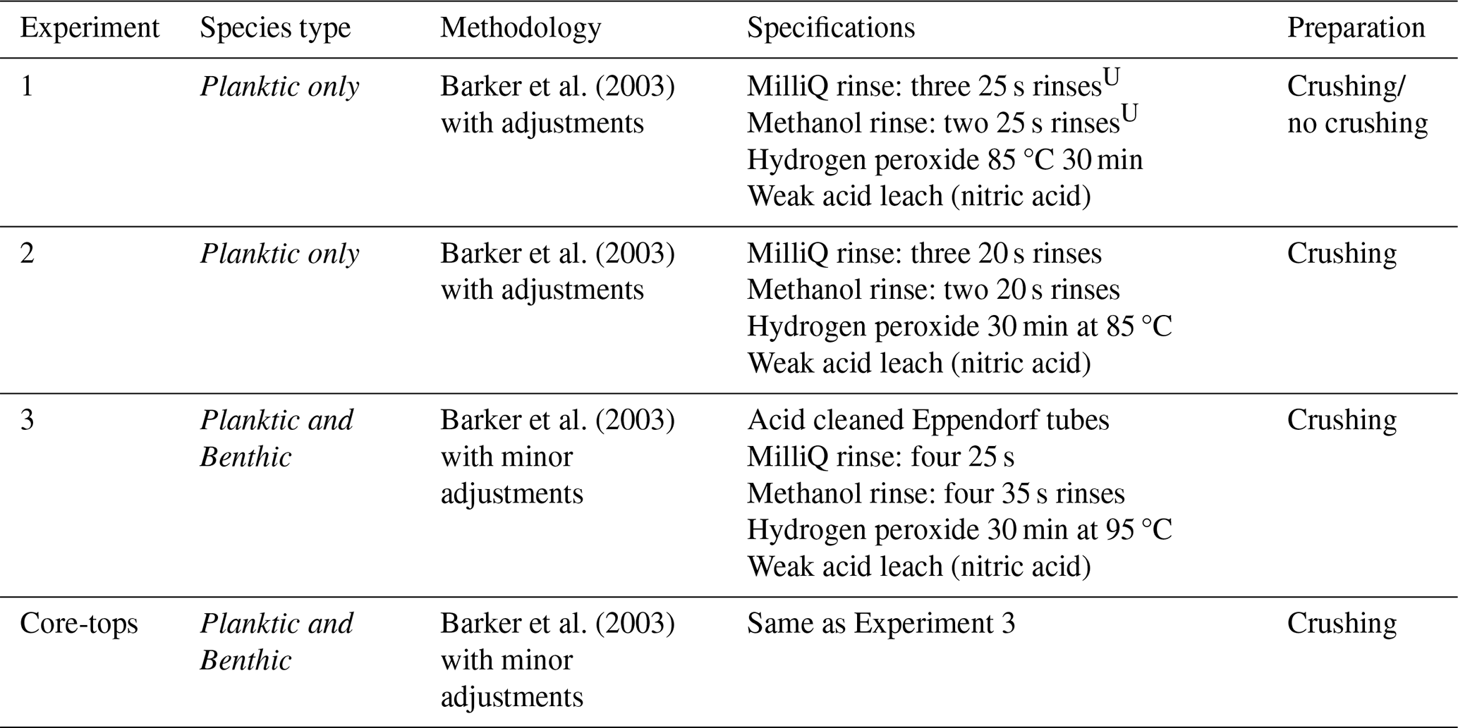 Based on the results from Experiment 3, indicating no or minor silicate contamination and Mn-oxide coatings, the cleaning methodology of core-tops followed the methodology used in Experiment 3, i.e. Barker et al. (2003). A summary of the differences in cleaning methodology used in this study is found in Table 2.