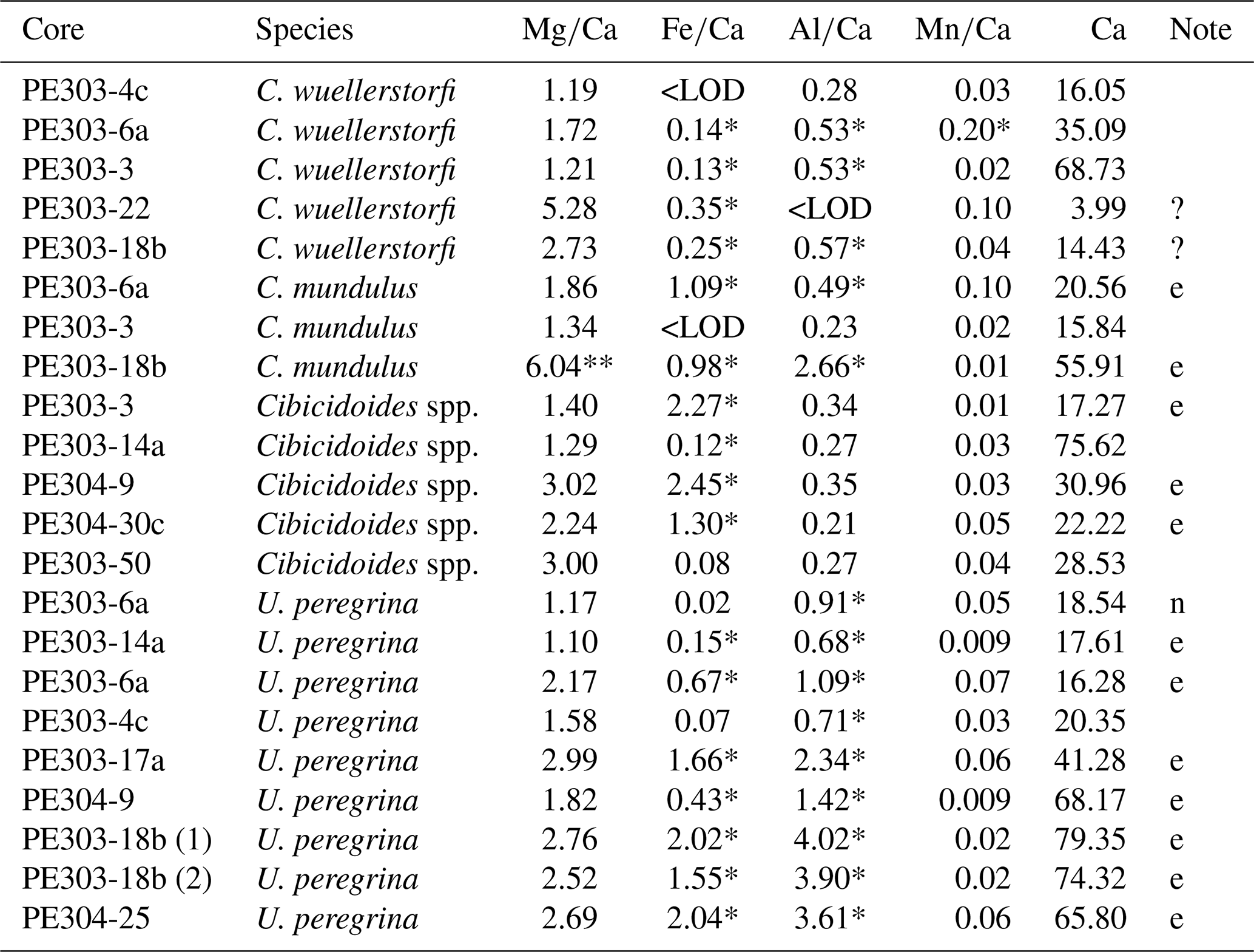 * Above contamination threshold 0.1, 0.4, and 0.1 mmol mol−1 for , , and (Elderfield et al., 2010). ** clear outlier based on typical range reported in previous studies. e = excluded due to high contamination, ? = ambiguous assessment of contamination. <LOD = below limit of detection. n = not excluded based on Elderfield et al. (2006) suggesting not to exclude samples based on above 0.4 mmol mol−1 alone, both and < 0.1 mmol mol−1.