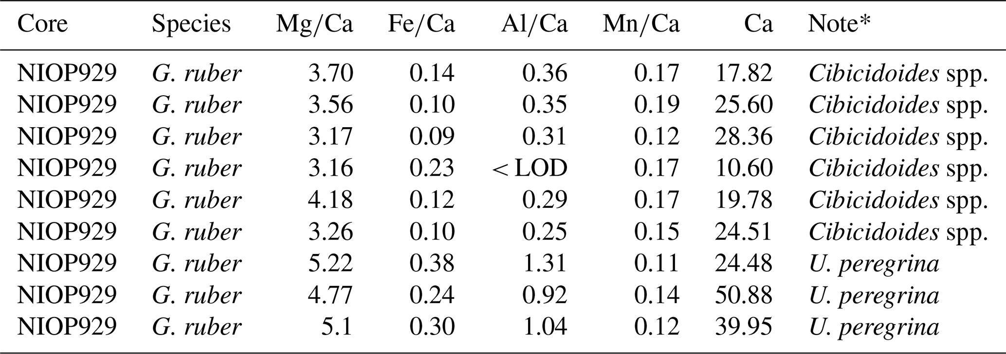 The range of ratios in U. peregrina was wider (0.02 to 2.04 mmol mol−1) than in C. wuellerstorfi (0.13 to 0.35 mmol mol−1; Table 3). This is consistent with Elmore et al. (2015, Supplement) reporting ratios below 0.1 mmol mol−1 in U. peregrina compared to ratios in C. wuellerstorfi below 0.04 mmol mol−1. Both ranges are below the contamination threshold (0.1 mmol mol−1) in contrast to ranges reported in this study. Elmore et al. (2015) also used the procedure of Barker et al. (2003). Samples containing G. ruber from core NIOP 929 were included in the analysis of core-tops and used as a control to monitor cleaning efficiency. On average, G. ruber contained , and ratios of 0.18, 0.60 and 0.15 mmol mol−1 (Table A4 in Appendix A). Both average ratios and average ratios in G. ruber from NIOP929 analysed in runs along with U. peregrina (0.31 and 1.09 mmol mol−1) were higher than that of G. ruber that were analysed in runs alongside Cibicidoides spp. (0.13 and 0.26 mmol mol−1; Table A4 in Appendix A). Since the same procedure was followed, the difference could point to an issue in the repeatability of the cleaning procedure, i.e. build-up of gas bubbles in the hot water bath during the oxidative step, insufficient crushing prior to cleaning, or different quantities of MilliQ water and methanol removed in between rinses affecting efficiency of contaminants being removed in every rinse. Alternatively, the different contamination levels can also result from different samples from core NIOP929 used due to insufficient specimens of G. ruber found within a single sample.