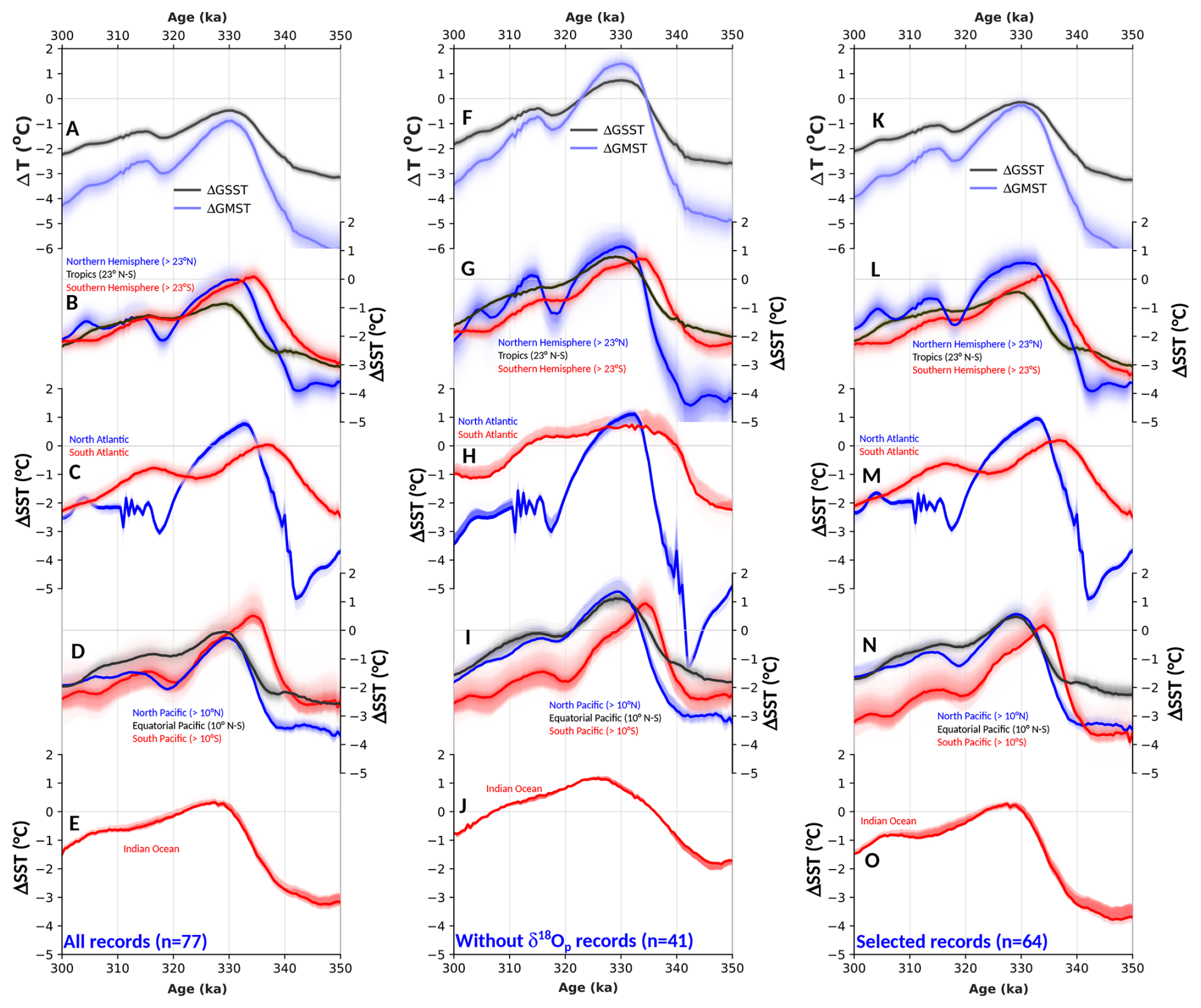 On a hemispheric scale (Fig. 4D), the MIS 10 glacial temperature ΔSST values are colder in the extra-tropic Northern Hemisphere (NH; −3.9 ± 0.7 °C) compared to the extra-tropic Southern Hemisphere (SH; −3.4 ± 0.4 °C). Tropical (between 23° N and S) area does not exhibit a distinct glacial maximum, and the colder temperature anomaly is −3.1 ± 0.2 °C at 350 ka. The hemispheric ΔSST stacks exhibit differences in shape, amplitude, and timing of the deglacial warming. In the SH (Fig. 4D), the deglaciation starts at 346 ± 0.25 ka, lasts approximately ∼ 11 ka and has an amplitude of warming of ∼ 3.2 °C. In the NH, the deglacial warming begins at 342 ± 0.25 ka, lasting for approximately ∼ 9 ka, with an amplitude of ∼ 4.5 °C (Fig. 4D). The Tropics, shows a deglacial warming at 338.5 ka and lasts ∼ 8 ka, with a lower amplitude of warming of ∼ 1.9 °C (Fig. 4D).