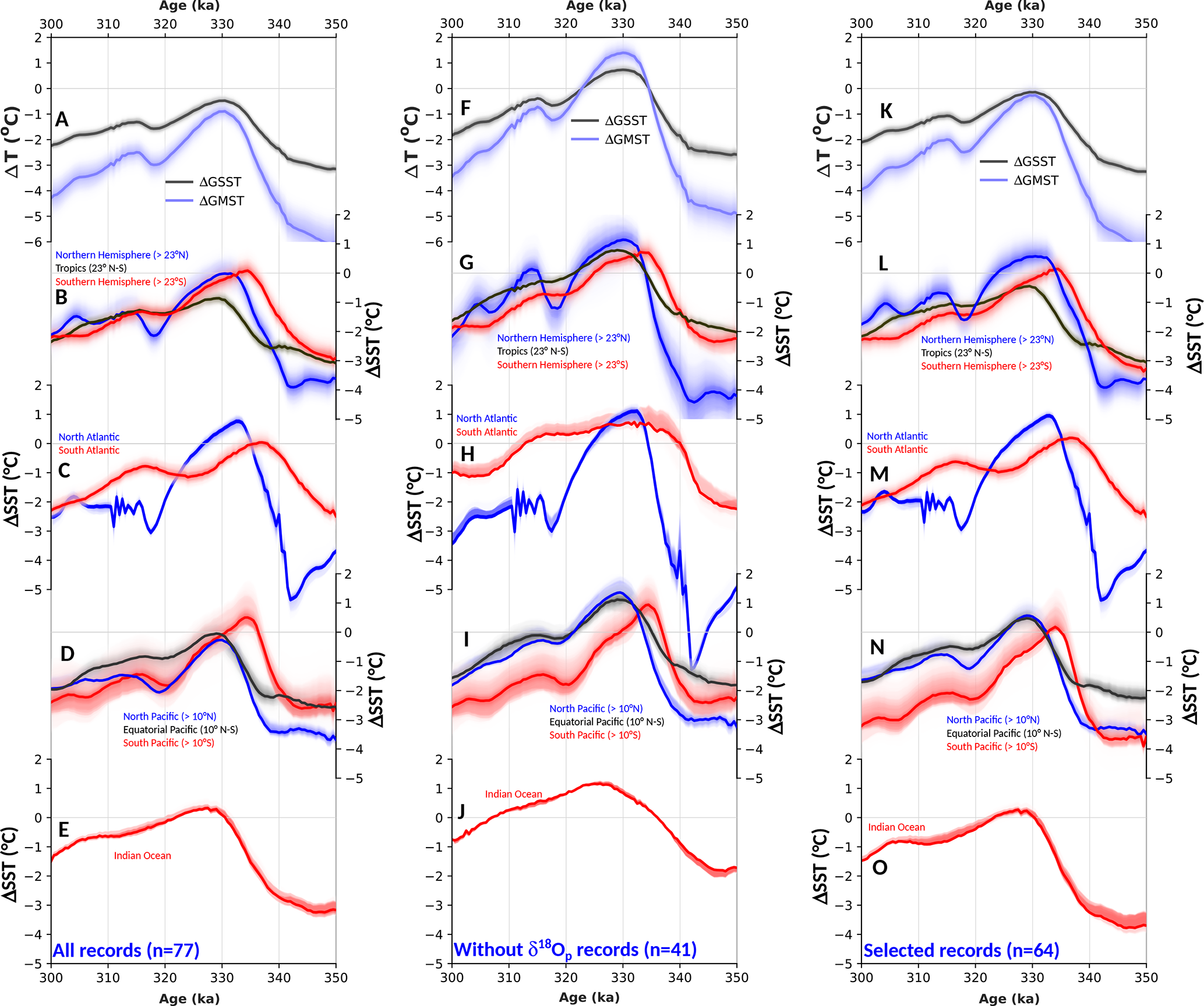 The test including all records (Fig. 3A–E) is broadly consistent with the others but results in lower SST values, indicating that inconsistent records tend to pull down the stacks and potentially bias the reconstructions. Excluding δ18Op-based SST (second test, Fig. 3F–J) produces the largest shift in values, but also strongly reduces the number of records. The “selected records” test (Fig. 3K–O) appears to provide a reasonable compromise: it excludes outlier estimates without systematically discarding one proxy type, while retaining a sufficient number of records to build robust stacks. We therefore adopt this third stacking approach for the analyses and interpretations that follow.