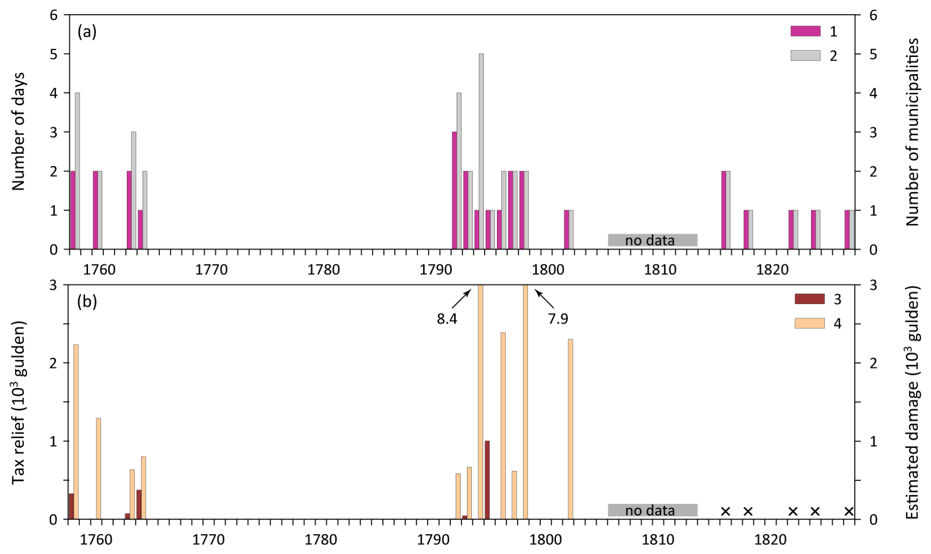 Using documentary evidence in historical-climatological research is strongly limited by the availability of corresponding data sources, as pointed out in several studies (e.g., Brázdil et al., 2005, 2010; White et al., 2018). This also applies to institutional evidence represented in this study by taxation records, which is particularly reflected in data gaps between 1708 and 1747 CE and further in the years 1806–1813 CE, as well as in the unavailability of records after 1827 CE. Corresponding data may have been lost in subsequent years or discarded when they lost their importance for the relevant institution, i.e. after the Gubernium's decision regarding the approval or refusal of the requested tax relief.