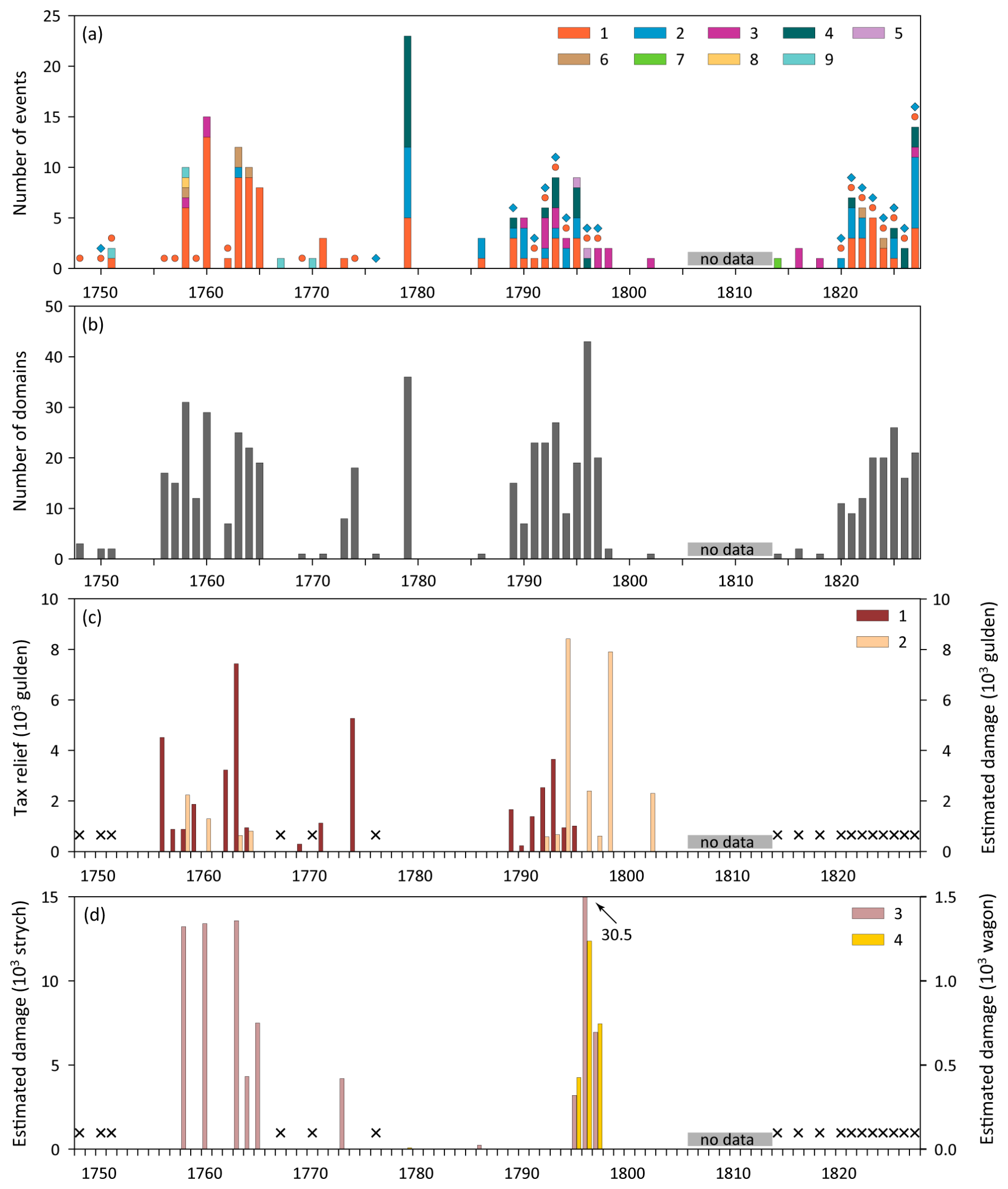 Figure 8Total annual weather-related damage in the Prácheň Region during the 1748–1827 CE period: (a) the number of reported damaging weather events (1 – hail, 2 – water torrent, 3 – lightning, 4 – hail and water torrent, 5 – hail, water torrent and lightning, 6 – hail and lightning, 7 – wind, 8 – drought, 9 – freezing; a circle indicates non-dated hail, a diamond indicates non-dated water torrent), (b) the total number of affected domains, (c) tax relief (1) and estimated damage (2) in guldens, (d) the estimated damage in strych (3) and in number of hay wagons (4); x indicates no tax relief/damage data.