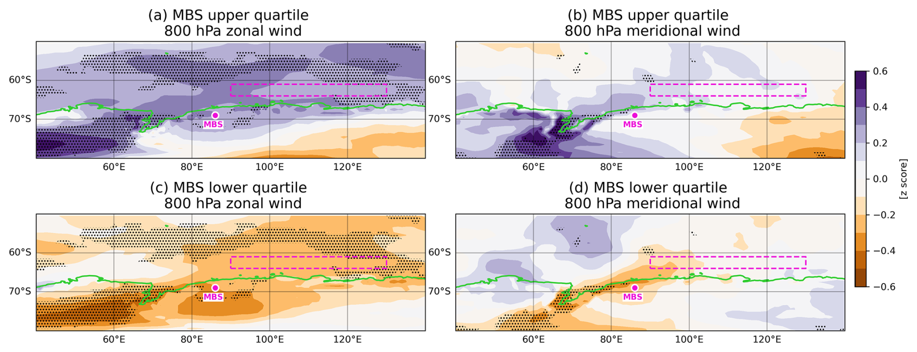 Synoptic–scale storms are investigated as a possible transport mechanism for the sea salt arriving at MBS through wet deposition. Previous studies have noted the extreme precipitation event bias in the MBS ice core (Jackson et al., 2023). Therefore, it is necessary to include precipitation when looking at transport mechanisms. The daily total precipitation for austral winter years in the MBS upper and lower quartiles over the MBS site are calculated using the hourly precipitation data from ERA5. The maximum five precipitation days for each year in the quartiles respectively are defined as extreme precipitation events, and then composite maps for the MBS upper and lower quartiles are created using the five highest precipitation days of each year 800 hPa meridional and zonal wind daily averaged hourly data from ERA5. Analysing the circulation over these 5 d provides an insight into where the winds were travelling from before they arrived at MBS, since back trajectories were beyond the scope of this study.