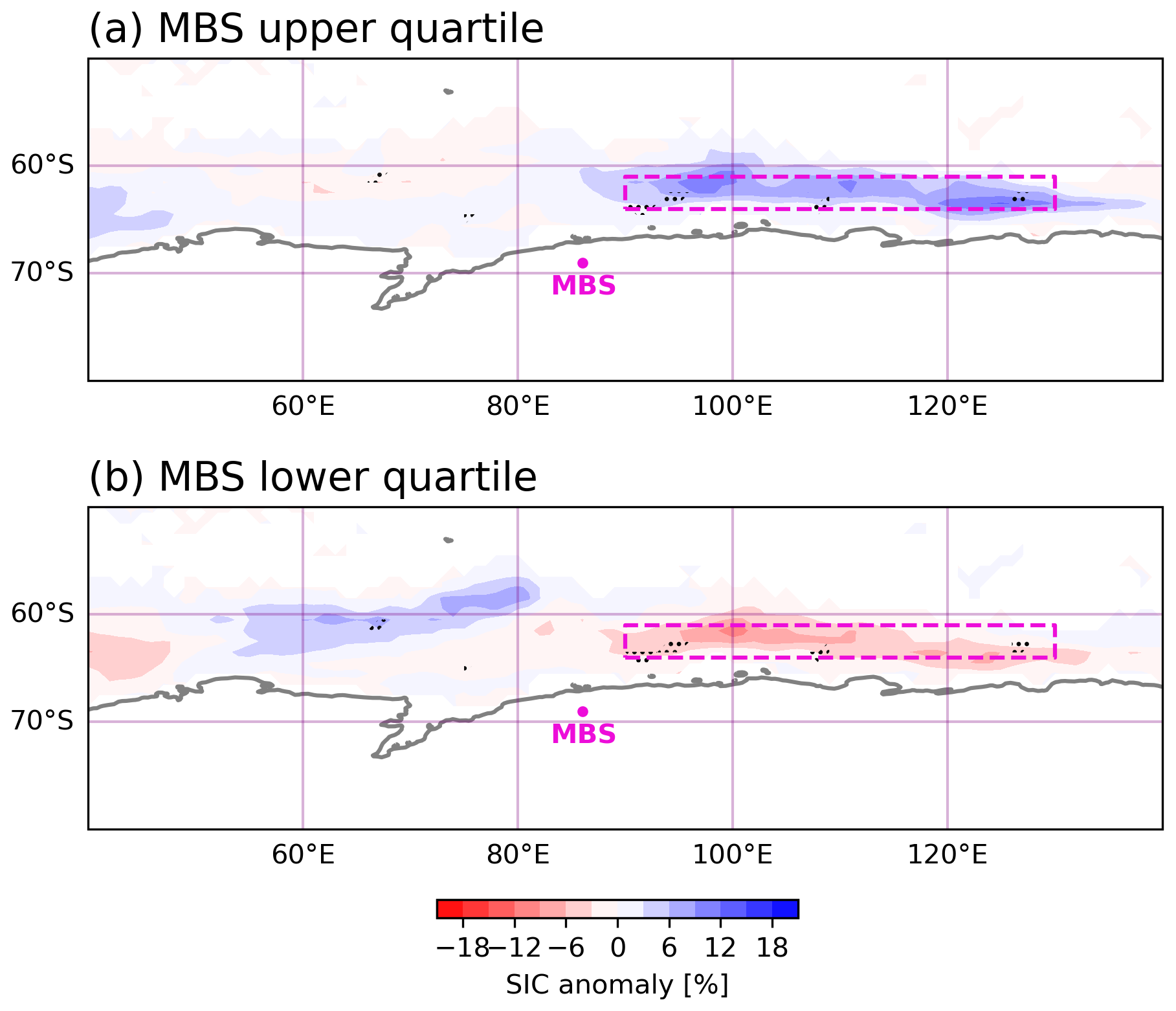 Next, the SIC is analysed to investigate the changes of sea ice in the MBS region, as newly formed sea ice is a potential source of sea salt aerosol, in addition to blown snow over sea ice covered regions. North and east of the MBS site, a signal of higher SIC anomalies is observed in the upper quartile composite constructed from the MBS sea salt record (Fig. 3a). Conversely, in the lower quartile composite, lower SIC anomalies are observed (Fig. 3b). This is consistent with previous studies that found higher sea salt concentration during winter and glacial periods when sea ice is more prominent (Petit et al., 1981; Pasteris et al., 2014). The MBS northeast coast box averaged SIC is chosen to encompass the high and low SIC anomaly over 61–64° S, 90–130° E (Fig. 3). The correlation between the box-averaged SIC and the MBS sea salt concentration has an r value of 0.448, over the period 1979–2016. This is a statistically significant relationship at the 0.05 % level and shows that when there is higher SIC off the northeast coast of MBS, there is higher sea salt concentration in the MBS ice core. The MBS northeast coast box-averaged SIC is also correlated with the mean zonal and meridional winds in the MBS northeast coast box. The zonal wind and SIC have an r value of 0.350, while the meridional wind and SIC have an r value of 0.555. Both are statistically significant relationships at the 0.05 % level. The mean zonal (meridional) wind is westerly (northerly) and there is a relationship between increased (weakened) strength and higher SIC. These relationships can be understood physically: the correlations are consistent with the mean–state northerly winds transporting sea ice towards the coast and therefore, a weakening in these winds implies less transport towards the coast and thus increased SIC in the outer pack. The strengthening of the mean–state westerly winds will enhance northward Ekman transport of sea ice (increasing SIC), as Ekman transport theory dictates that sea ice will drift 45° to the left of the wind direction (UCAR, 2008; Purich et al., 2016), also increasing SIC in the outer ice pack.