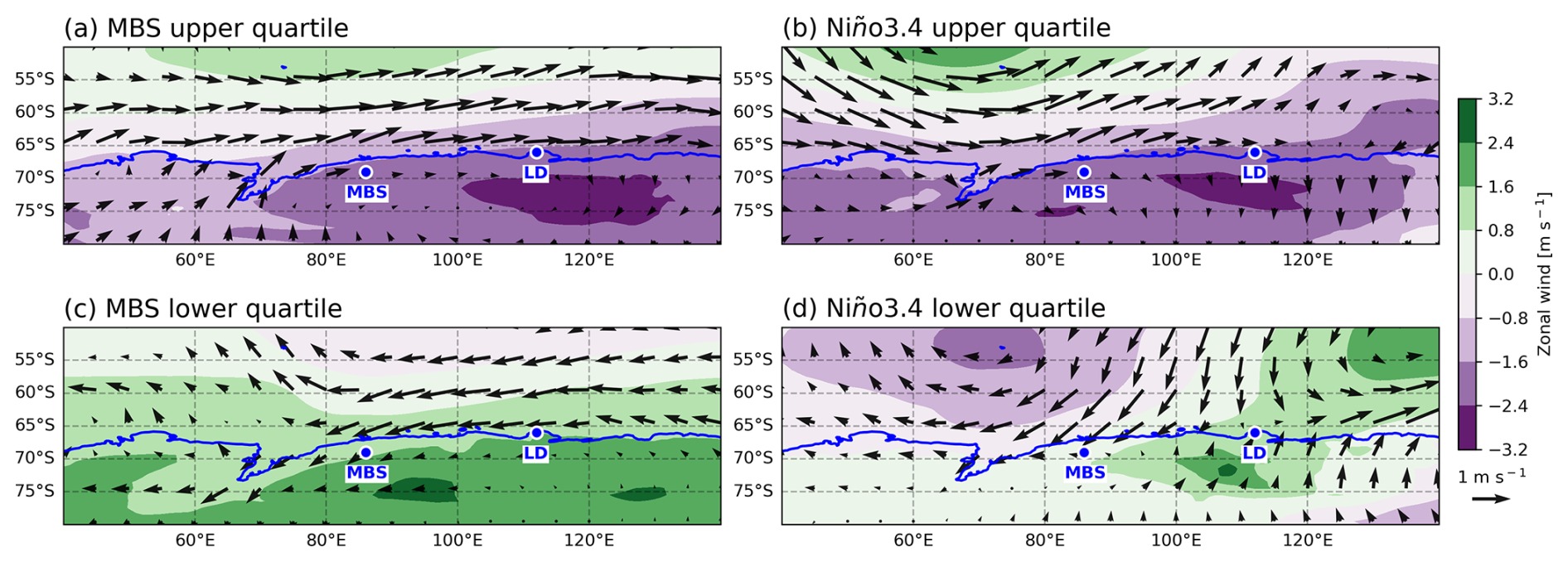 The MSLP composite map for the upper MBS sea salt concentration quartile shows a low-pressure anomaly over continental Antarctica, including near MBS (Fig. 1a; contours, Fig. A1a) and a strong El Niño signal in the corresponding SST composite (Fig. 1a; shading). In contrast, in the MBS lower quartile there is a high–pressure anomaly over continental Antarctica near MBS (Fig. 1b; contours, Fig. A1b) and no substantial La Niña signal in the SST pattern (Fig. 1b; shading). This shows that there is a nonlinear relationship between the MBS sea salt concentrations and ENSO, with an El Niño signal but no La Niña signal detected (this relationship is further explored in Sect. 3.2 and 3.3). In the upper quartile composite, the pressure gradient leads to strengthened westerly wind anomalies off the coast of MBS. Conversely, the lower quartile pressure anomaly creates easterly wind anomalies further east off the coast of MBS, compared to the upper quartile (Fig. 1).