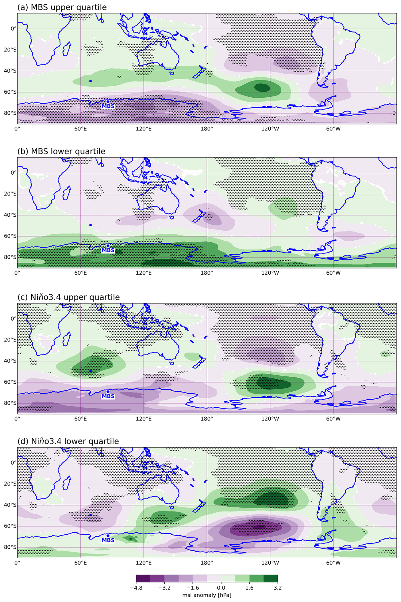 The low MSLP anomaly over the continent, including near MBS in the Niño3.4 upper quartile (i.e. El Niño-like conditions) in Figs. 8a and A1c is consistent with the low MSLP anomaly in the same position for the MBS upper quartile in Figs. 1a and A1a, although the low pressure in the Niño3.4 upper quartile is not robust like the MBS upper quartile (Appendix Fig. A1). The high MSLP anomaly over the continent, including near MBS in the lower quartile of MBS (Figs. 1b, A1b) is not as clearly seen in the Niño3.4 lower quartile in Figs. 8b, A1d.