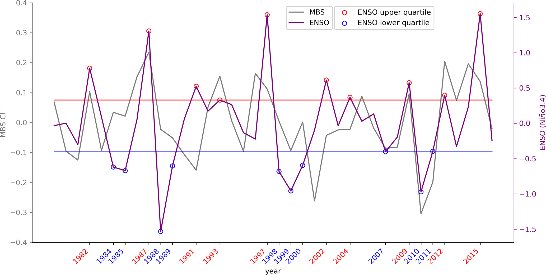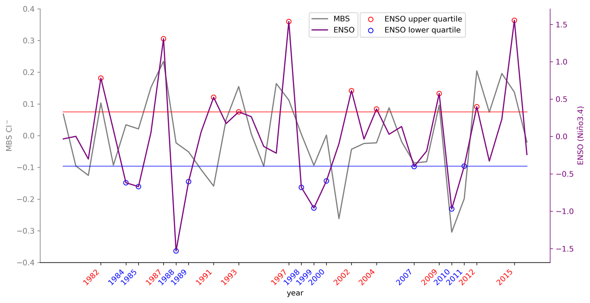 Figure A2Time series of the annual detrended, log–transformed sea salt concentrations for the Mount Brown South site average (MBS Cl−) and the detrended (June–August) El Niño–Southern Oscillation region SST anomalies (Niño3.4). Red line (blue line) indicates the Niño3.4 upper (lower) quartile boundary. Red and blue years on the x axis represent the Niño3.4 upper and lower quartile years.