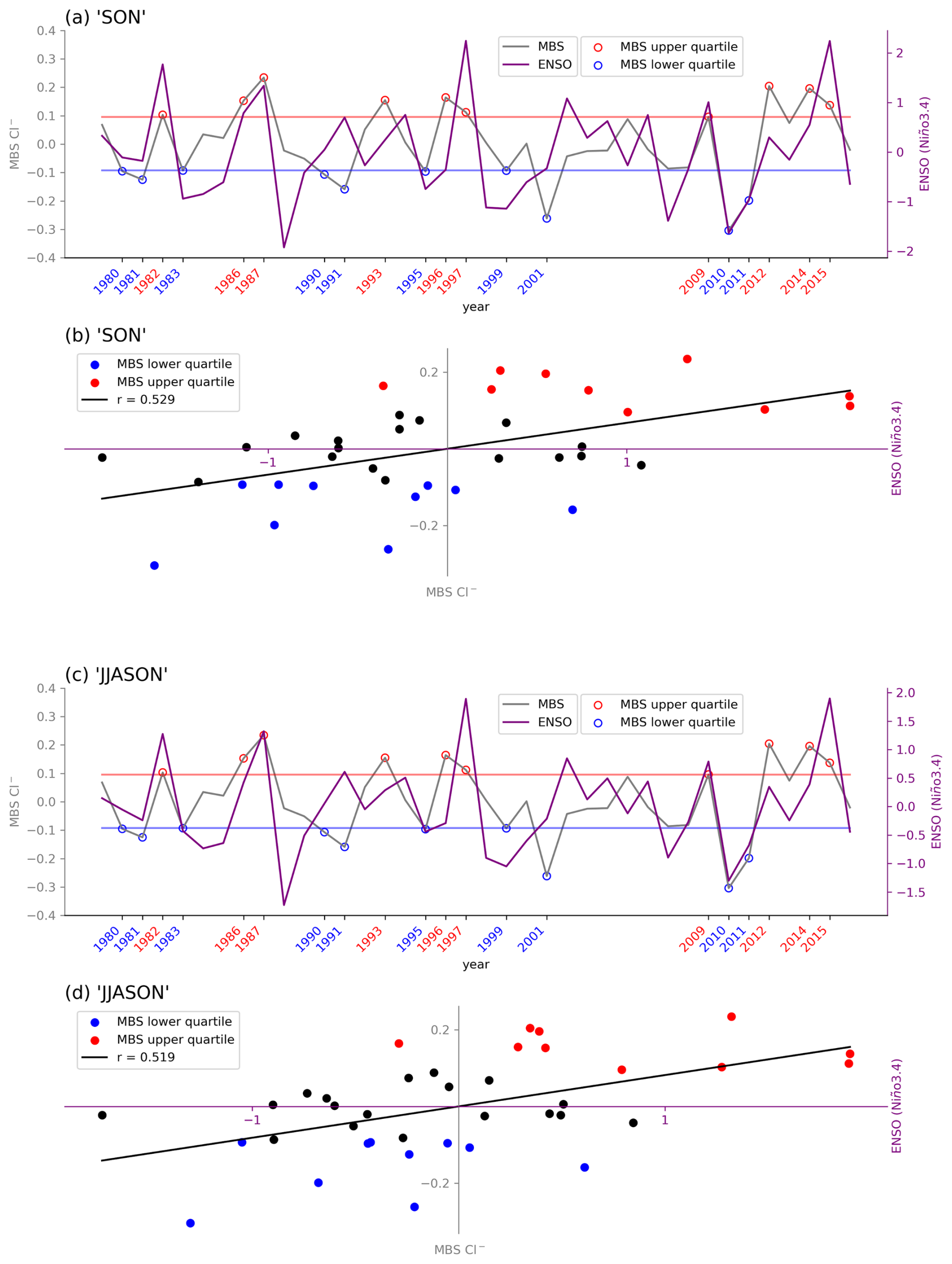 Figure A3Time series of the annual detrended, log–transformed sea salt concentrations for the Mount Brown South site average (MBS Cl−) and the detrended (a) (September–November), (c) (July–November) El Niño–Southern Oscillation region SST anomalies (Niño3.4). Red line (blue line) indicates the upper (lower) quartile boundary. Scatter plot shows the relationship between the MBS Cl− and (b) (September–November) Niño3.4 (d) (July–November) Niño3.4 with the MBS upper (lower) quartile highlighted by the red dots (blue dots) based on the period 1979–2016.