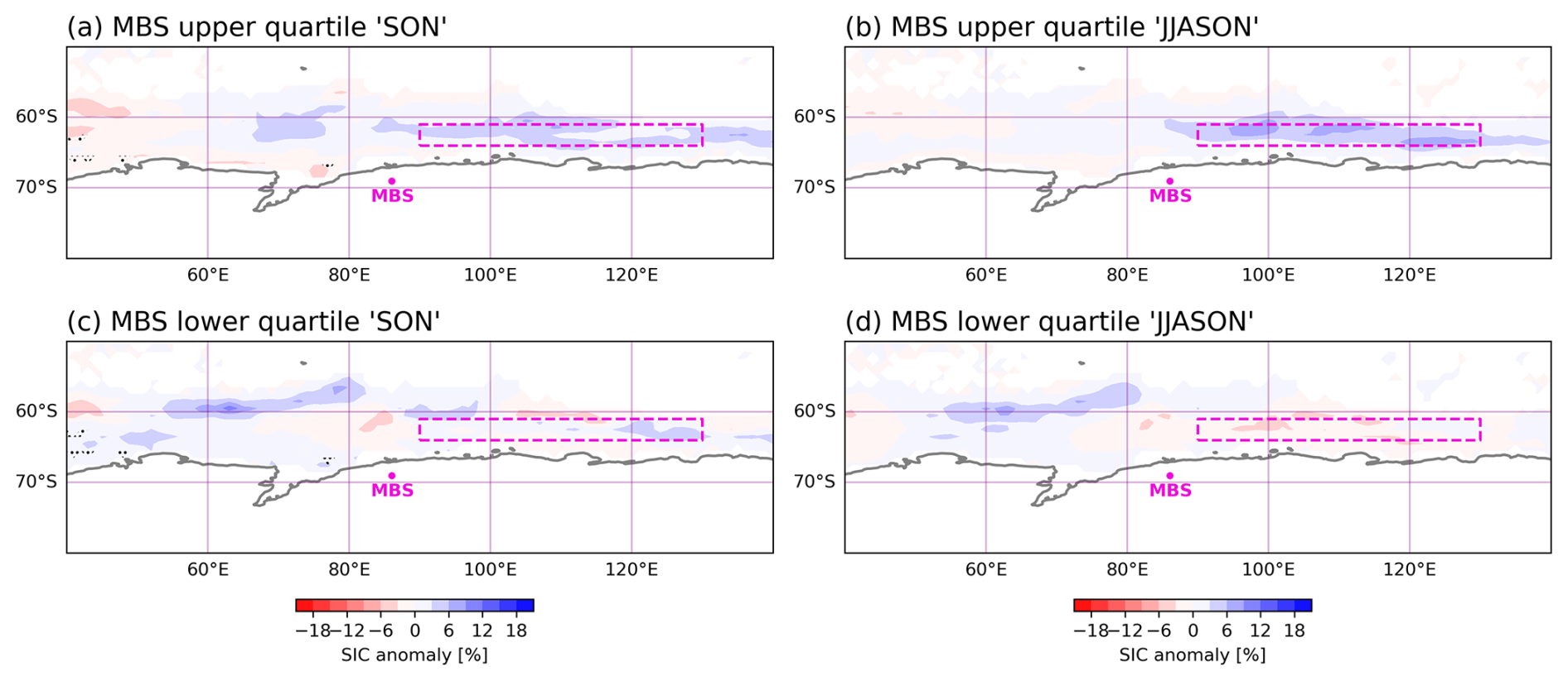 The anomalous westerly winds off the MBS coast in the upper quartiles is notable (Fig. 6a, b). As discussed above, this can induce two possible sea salt production mechanisms. Firstly, strengthened westerly winds increase sea salt aerosol lofting from open ocean sea spray. Secondly, in response to the strengthened westerly winds, there will be enhanced northward Ekman transport of sea ice. This ice transport mechanism will increase the SIC on the outer (equatorward) side of the ice pack and increase sea ice formation closer to the coast, with sea ice providing a source of sea salt, either by blowinng snow over sea ice or frost flowers (Frey et al., 2020). The opposite happens during the years with MBS sea salt in the lower quartiles. This is, the easterly wind anomalies (weaker westerly winds) tend to reduce open ocean aerosol lofting, as well as reducing northward Ekman transport of sea ice, decreasing the SIC in the outer ice pack, and limiting the formation of new sea ice in the inner ice pack due to lack of exposed ocean there, thus resulting in an overall lower source of sea salt.