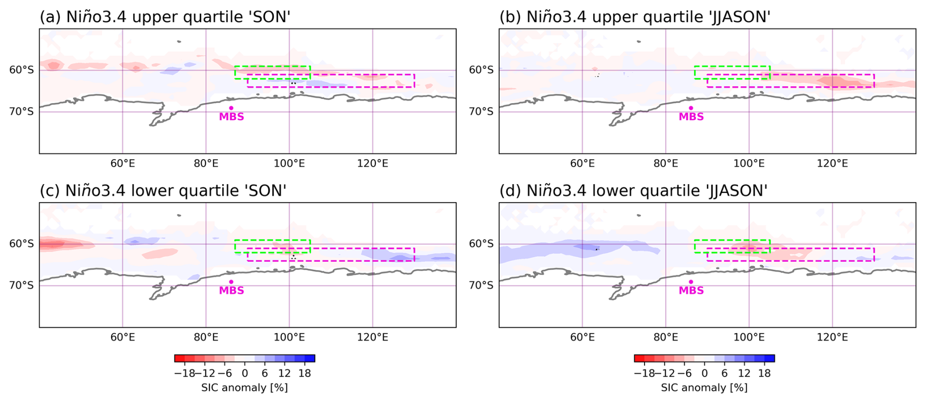 Figure A9Composite maps of the (a, c) September–November (SON), (b, d) July–November (JJASON) sea ice concentration for the Niño3.4 (a) SON, (b) JJASON upper and (c) SON, (d) JJASON lower quartile. The stippling indicates points where the K-S test p value is < 0.1. The MBS northeast coast box (61–64° S, 90–130° E) highlighted by the fuchsia dashed line while the fuchsia dot indicates MBS.