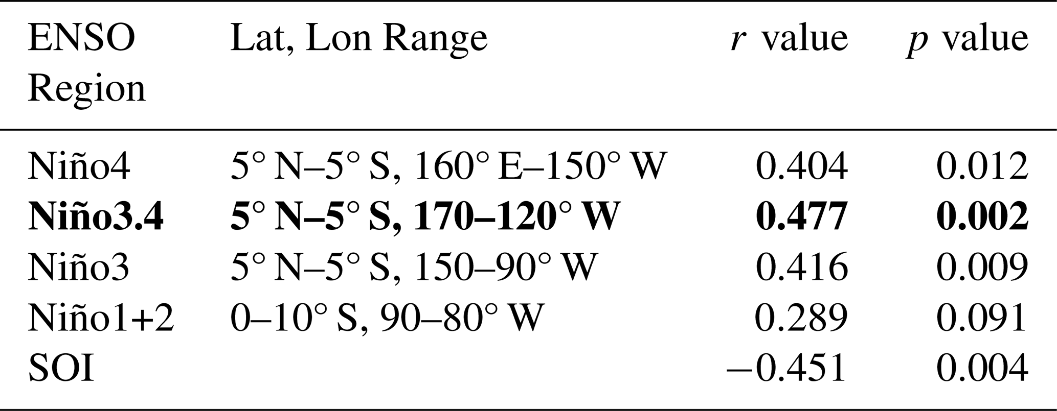 To put the MBS regional atmospheric circulation and sea ice anomalies into context, and given the strong El Niño-like signal in the tropical Pacific in the MBS upper quartile composite (Fig. 1a), we turn our focus to investigate the ENSO influence on the MBS core. We first consider correlations between the annual MBS Cl− concentration (MBS Cl−) and different ENSO indices (Table 1). The MBS ice core was not seasonally resolved at the time of this study, therefore austral winter SST in the tropical Pacific was compared to the annually resolved site averaged sea salt concentration. From Table 1, Niño3.4 was shown to have the strongest connection to the MBS sea salt concentration, with an r value of 0.477, which is significant at the 0.2 % level. Therefore, Niño3.4 was used for further analysis.