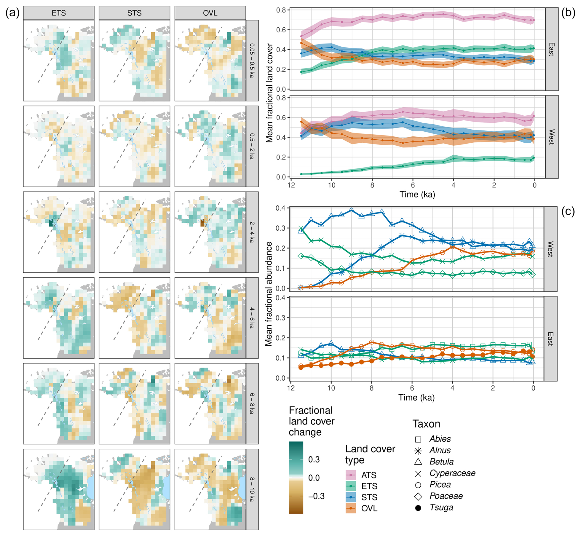 Figure 5(a) Land cover difference maps for ETS, STS, and OVL for the eastern Canada (ECAN) case study. (b) Holocene trends in the relative-to-time-t mean land cover of the three land cover types (ETS, STS, OVL) and the ATS sum for the uninterpolated REVEALS grid cell estimates across the ECAN region. (c) Holocene trends for the REVEALS abundance estimates for the six most commonly occurring taxa in the region. For both panels, figure conventions follow Fig. 4. For taxon-level maps, see Fig. S10.