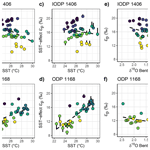 Our new < 1 million year resolution εp records from these two mid- latitude locations allow us to directly compare εp with estimates of SST derived from alkenones extracted from the same samples, since unlike very warm tropical locations, the index still retains sensitivity to temperature in the mid-latitudes during the Oligocene and early Miocene. Additionally, we compare εp with benthic δ18O available from the same sediments. Variations in benthic δ18O are controlled by changes in both deep-water temperature and deep ocean δ18Osw which reflects ice volume. We further measure εp and benthic δ18O at approximately 20–30 ky resolution over a series of eccentricity cycles in the early Oligocene at IODP 1406. The dataset allows a robust evaluation of the relationship between εp and climate for this time interval. We further discuss the significance of the observed εp record with the implications for the phytoplankton sensitivity over multimillion year timescales over the Cenozoic.
